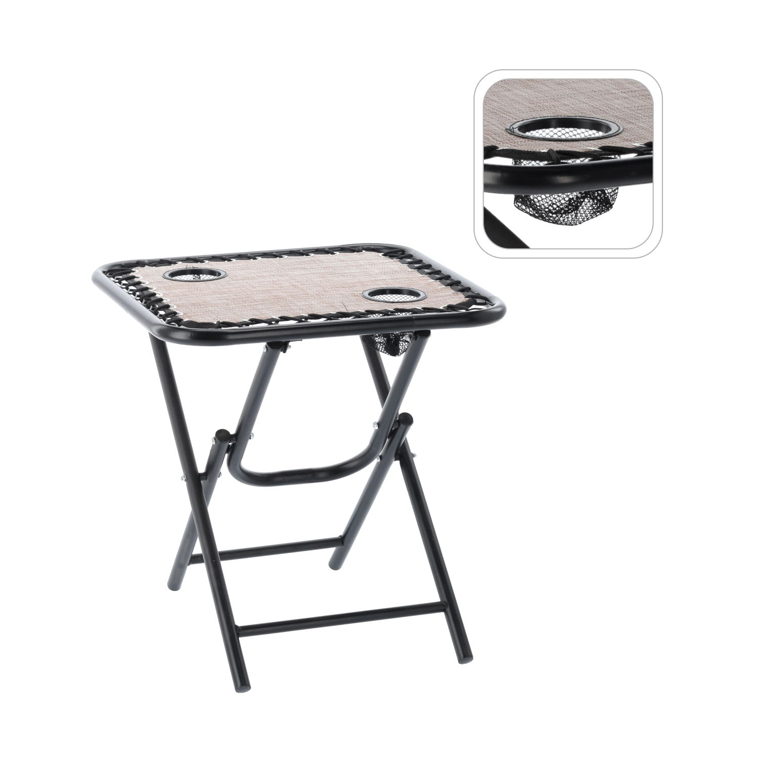 Kompaktna in praktična zložljiva mizica za kampiranje, piknike in vrt. Zahvaljujoč čvrsti kovinski konstrukciji je stabilna na različnih podlagah, dva integrirana držala za pijačo pa varno držita vaše napitke pri roki. Hitro sestavljanje brez orodja in odpornosti na vremenske vplive jo naredita idealno izbiro za vse leto.