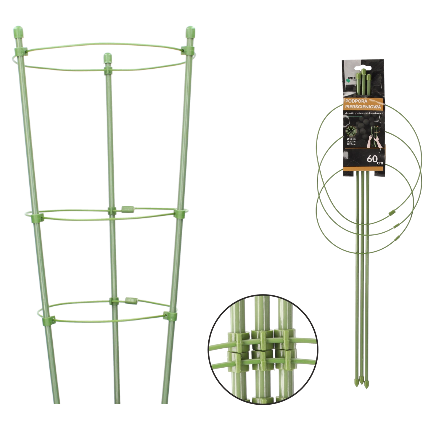 Ta krožna opora je idealna za gojenje na gredah in v loncih. Konstrukcija iz jekla s polietilenskim premazom je zelo odporna na vremenske vplive in mehanske poškodbe, medtem ko je zeleno izvedbo v rastju skoraj nemogoče opaziti. Prepreči poleganje rastlin na tla in podpira njihov harmoničen in pokončen rast.