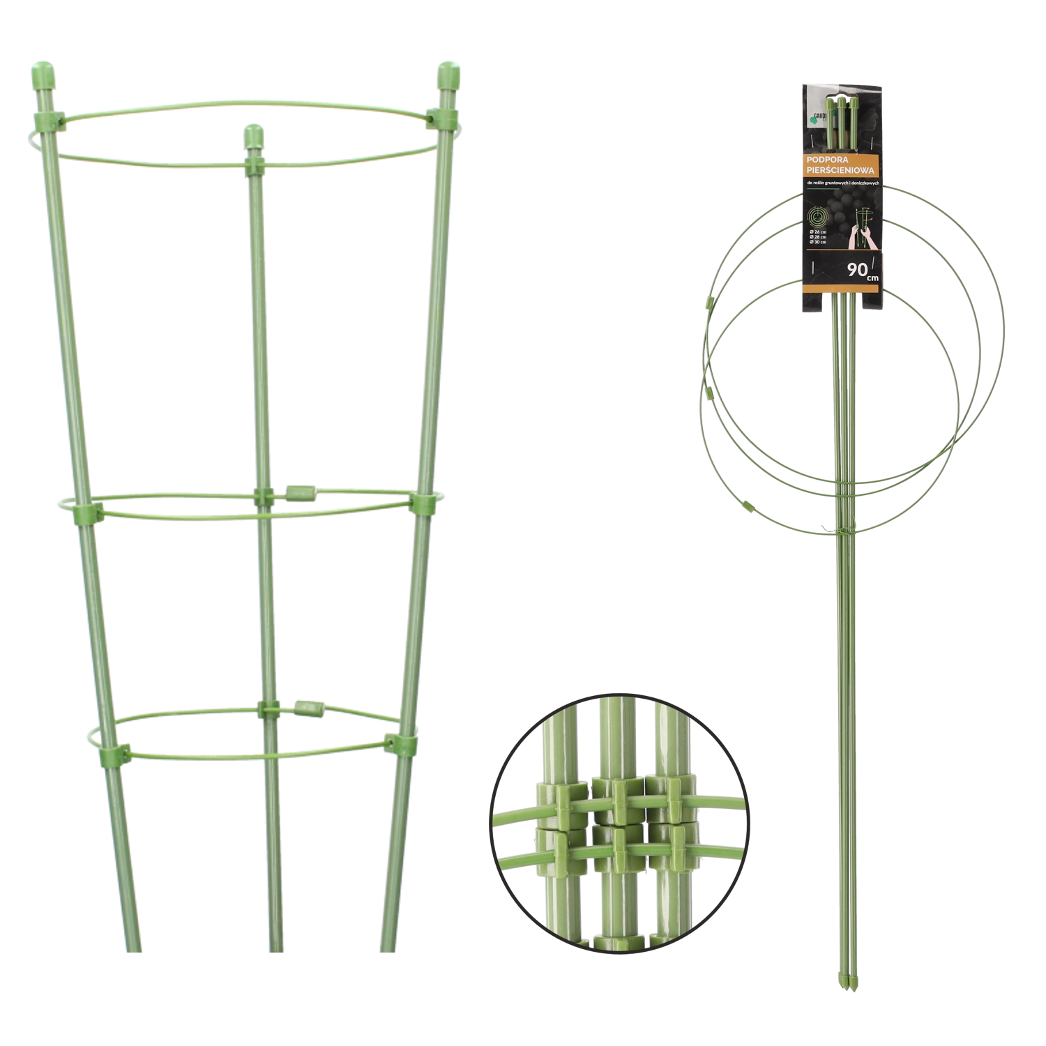 - Stabilna konstrukcija: trije obroči različnih premerov držijo rastlino po vsej višini.