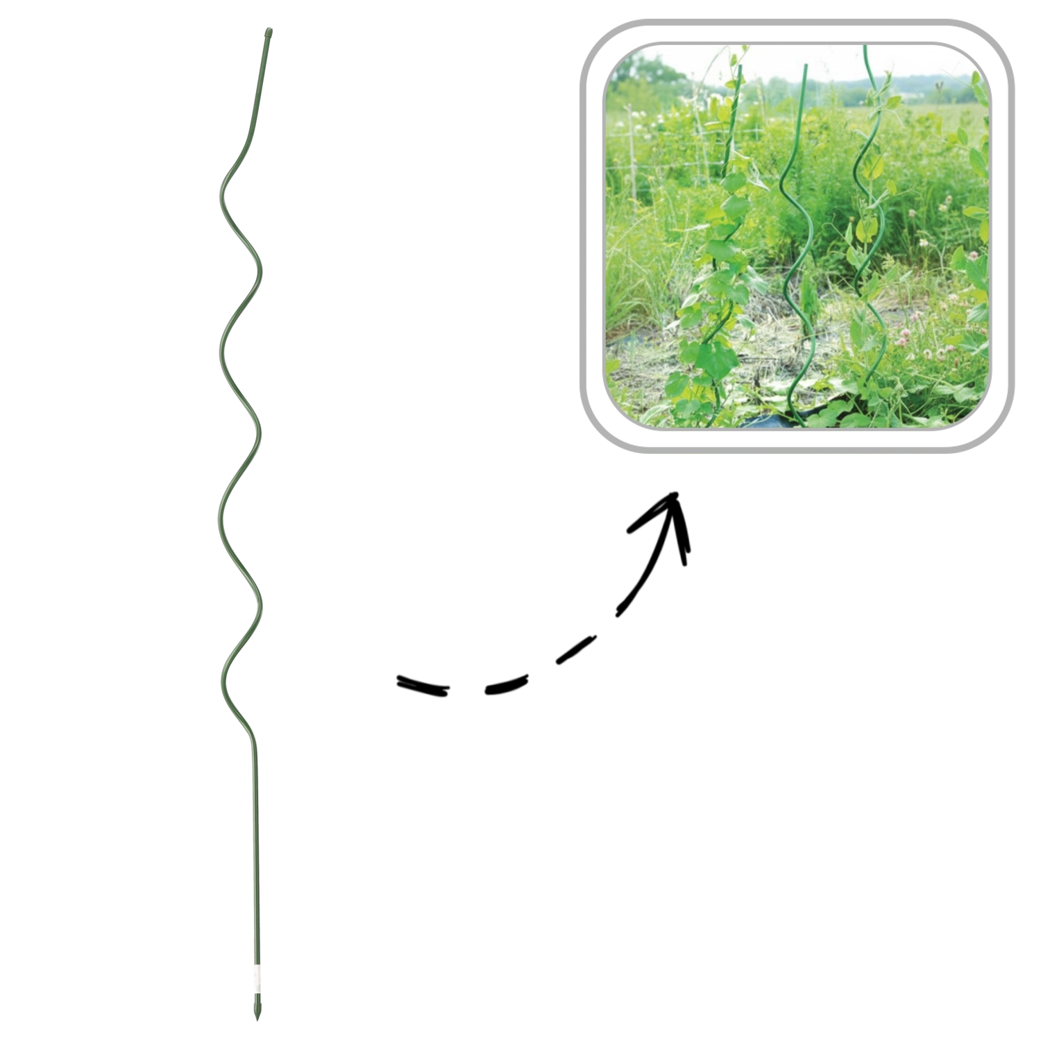 Spiralna oblika nudi rastlinam oporo po celotni dolžini stebla in zmanjšuje potrebo po privezovanju. Idealno za paradižnik, fižol in kumare.