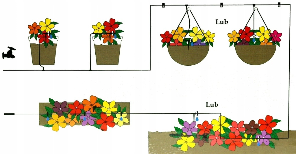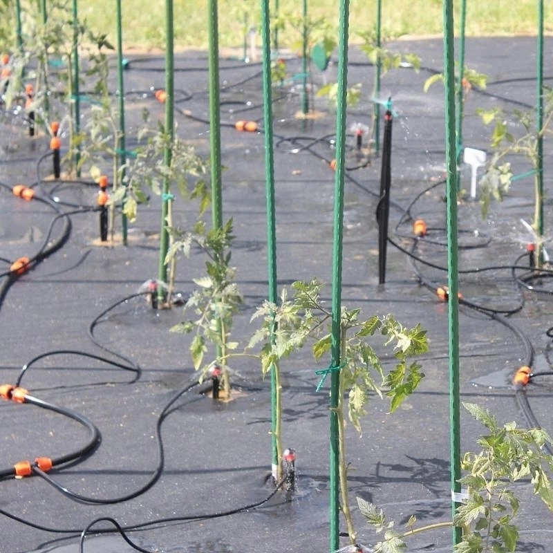 Prilagodljive cevi, T-spojke in zaključki omogočajo hitro sestavo sistema na gredici ali na protiplevelni tkanini. Nosilci z žebljem držijo vod dobesedno tam, kjer mora biti.