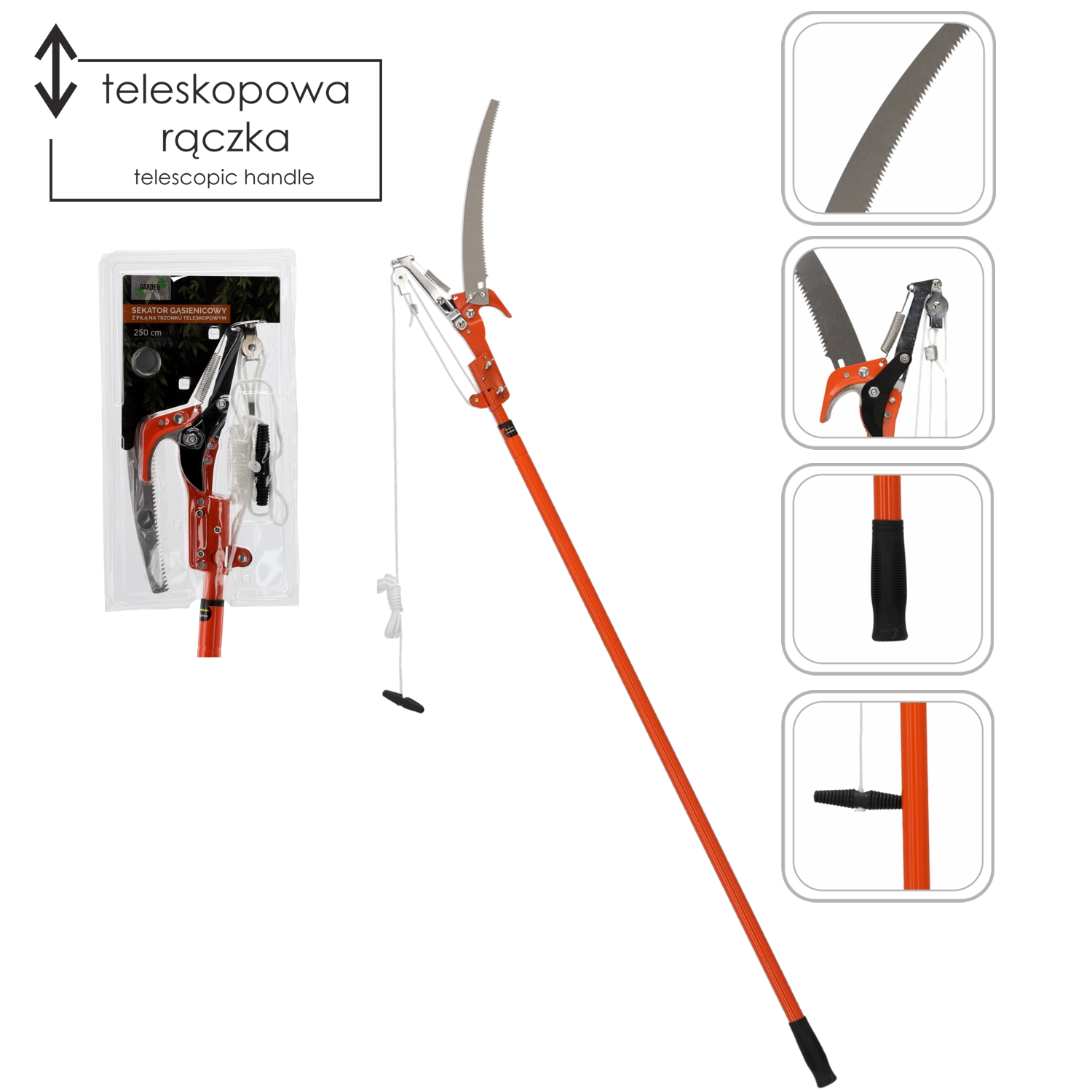 Ta vsestranski obrezovalnik združuje prednosti bypass škarij s kavljastim/vrvičnim prenosom in ukrivljene ročne žage. Orodje omogoča čist rez tanjših vej ter učinkovit rez debelejših vej z žago – vse to s tal. Teleskopska palica do 250 cm zagotavlja udoben doseg brez plezanja.