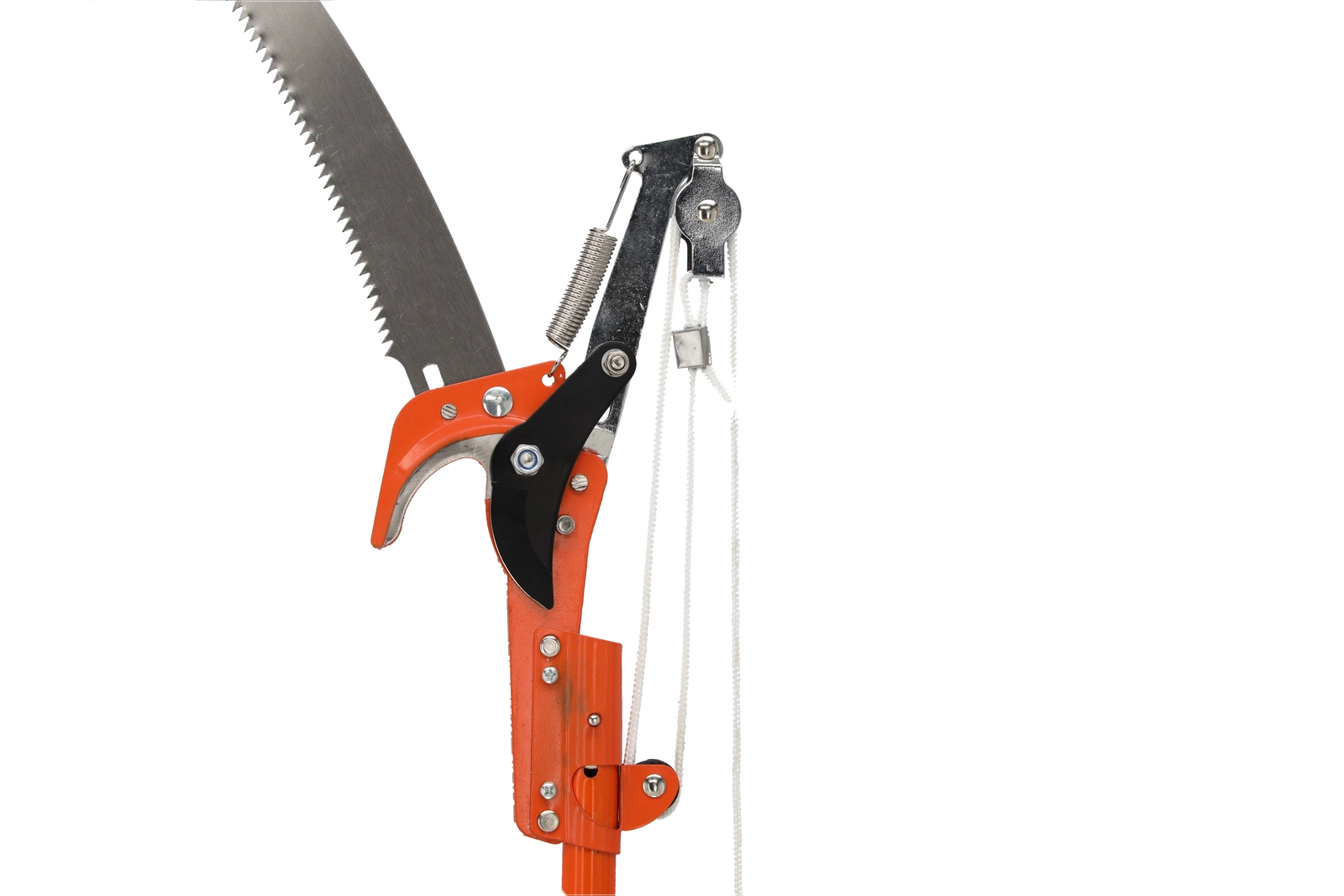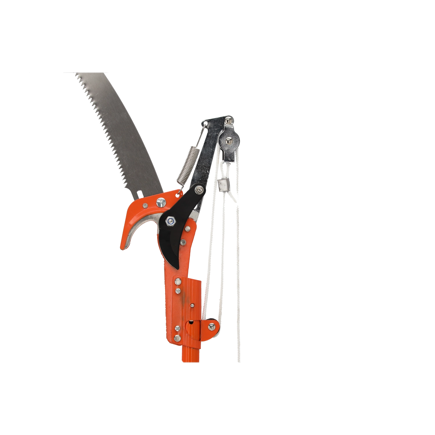Bypass škarje s kavljastim/vrvičnim prenosom za čist rez ter snemljiva ukrivljena žaga za debelejše veje za univerzalno delo na drevesih.