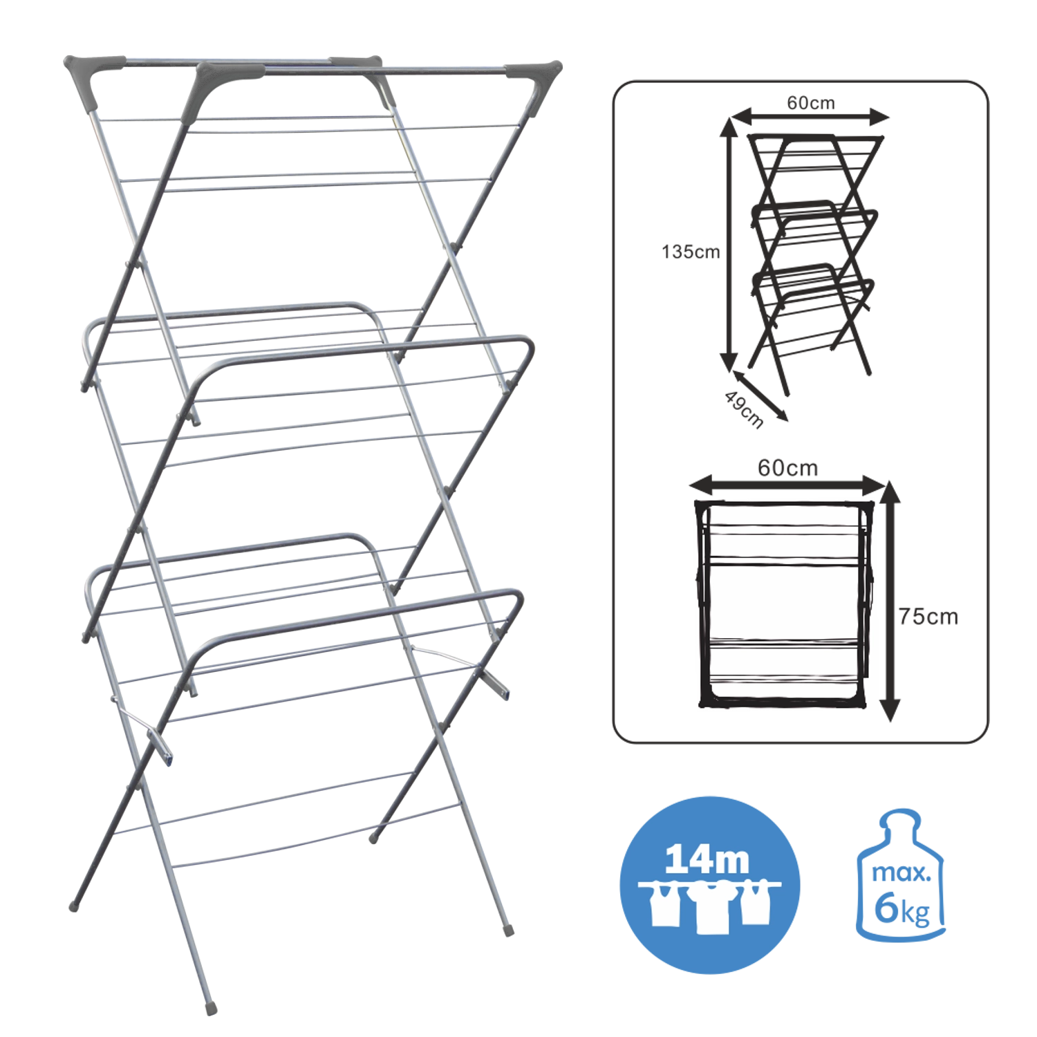 Praktično trinivojsko stojalo za sušenje perila CAMILLA prihrani prostor in omogoča učinkovito sušenje velike količine oblačil in tekstila. Zaradi kompaktnih mer je primerno za balkon, teraso in manjša stanovanja. Ponuja stabilno konstrukcijo, hiter pretok zraka za krajši čas sušenja ter preprosto zlaganje za prihranek prostora.