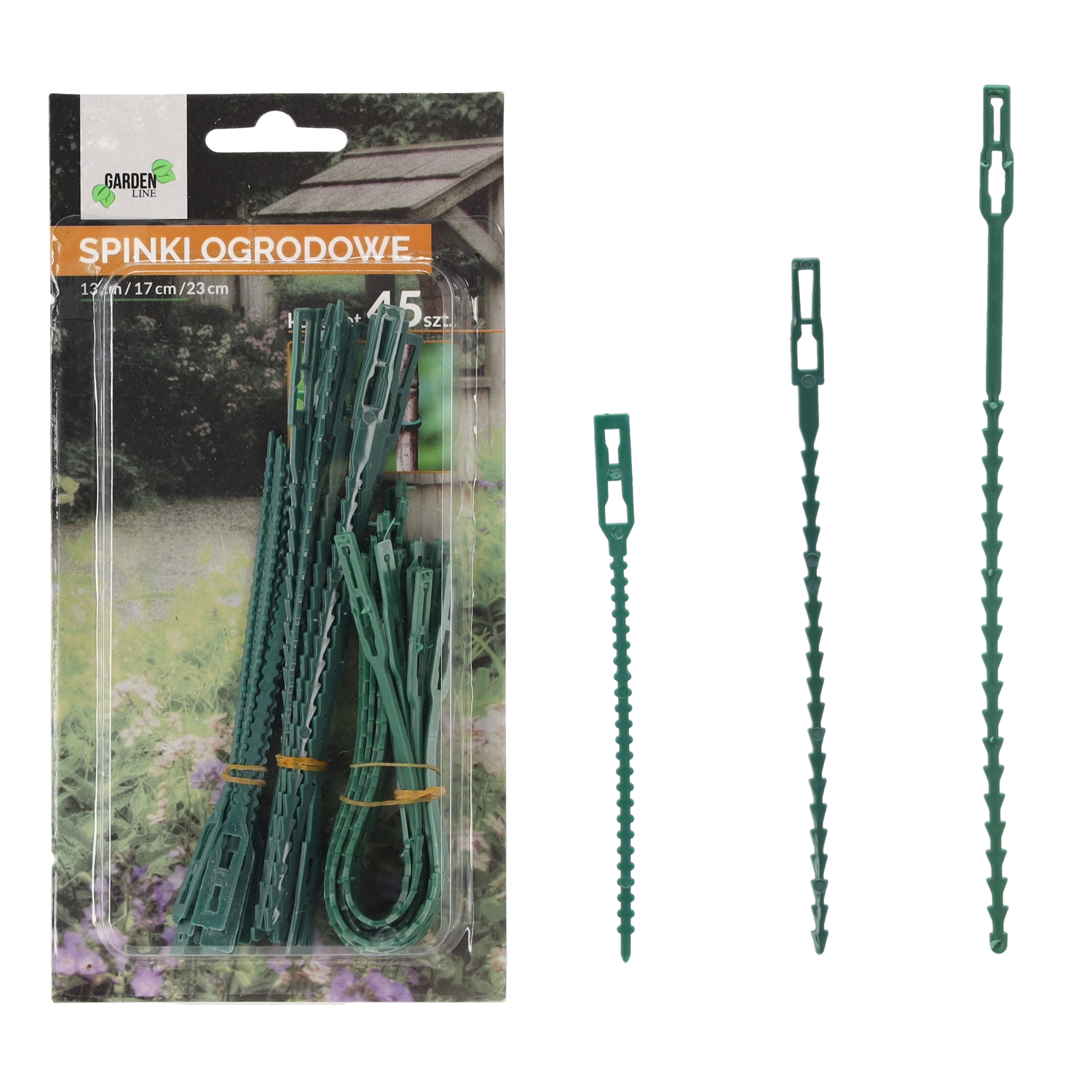 Praktičen set 45 vrtnih sponk v dolžinah 13, 17 in 23 cm za zanesljivo pritrjevanje rastlin na opore brez poškodovanja stebel. Trpežna in prožna plastika omogoča večkratno uporabo, medtem ko se zelena barva neopazno zlije z gredicami, rastlinjakom in balkonom.