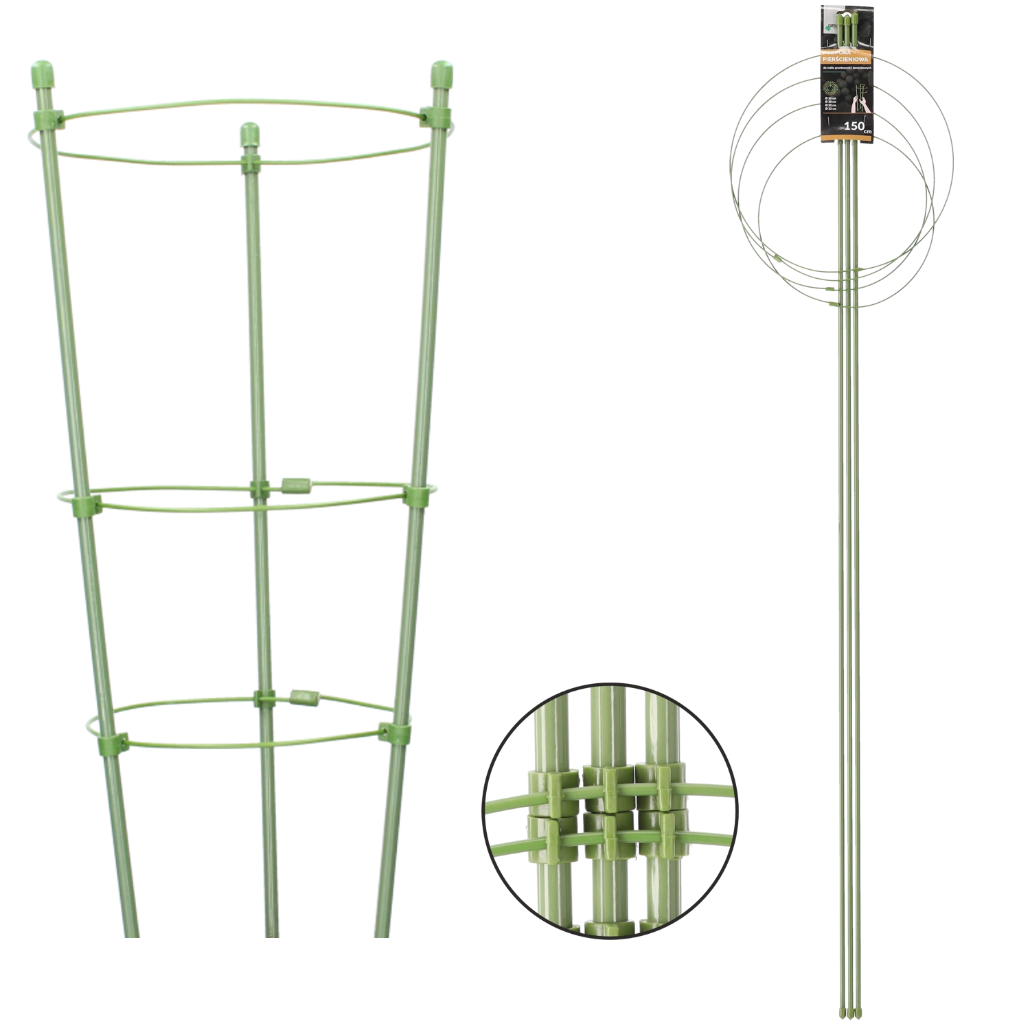 Praktična krožna opora za vrtne in sobne rastline višine 150 cm iz odpornega jekla, prevlečenega s PE. Zagotavlja stabilno oporo, preprečuje poleganje rastlin in podpira harmonično rast. Zaradi zelene barve je v nasadu skoraj nevidna in je odlična za borovnice, hortenzije ter druge grmovnice in trajnice.