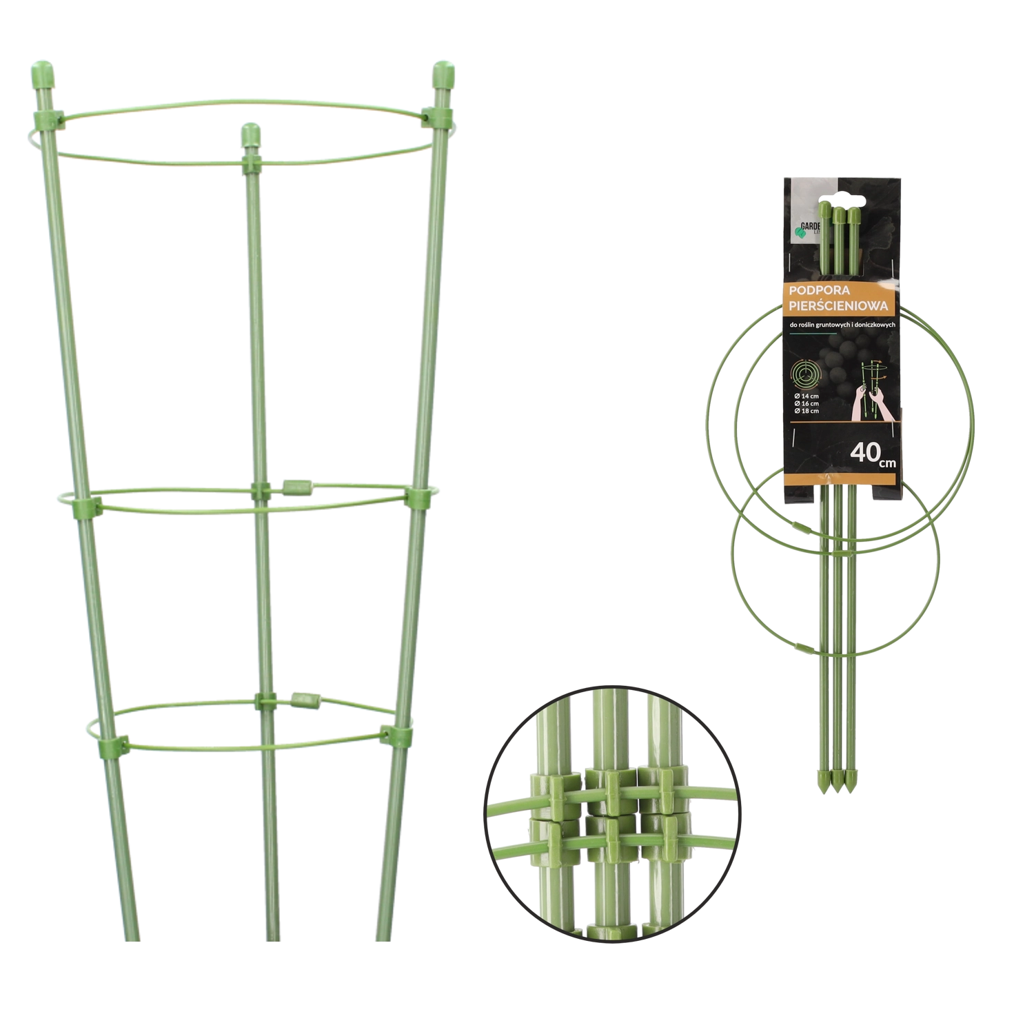 Ta krožna opora s tremi obroči je odličen izbor za sobne rastline, vrtne grede in manjše grmiče. Močno jeklo s polietilensko prevleko kljubuje vremenskim vplivom in mehanski obrabi, zeleno izvedbo pa je na gredi komaj opaziti.