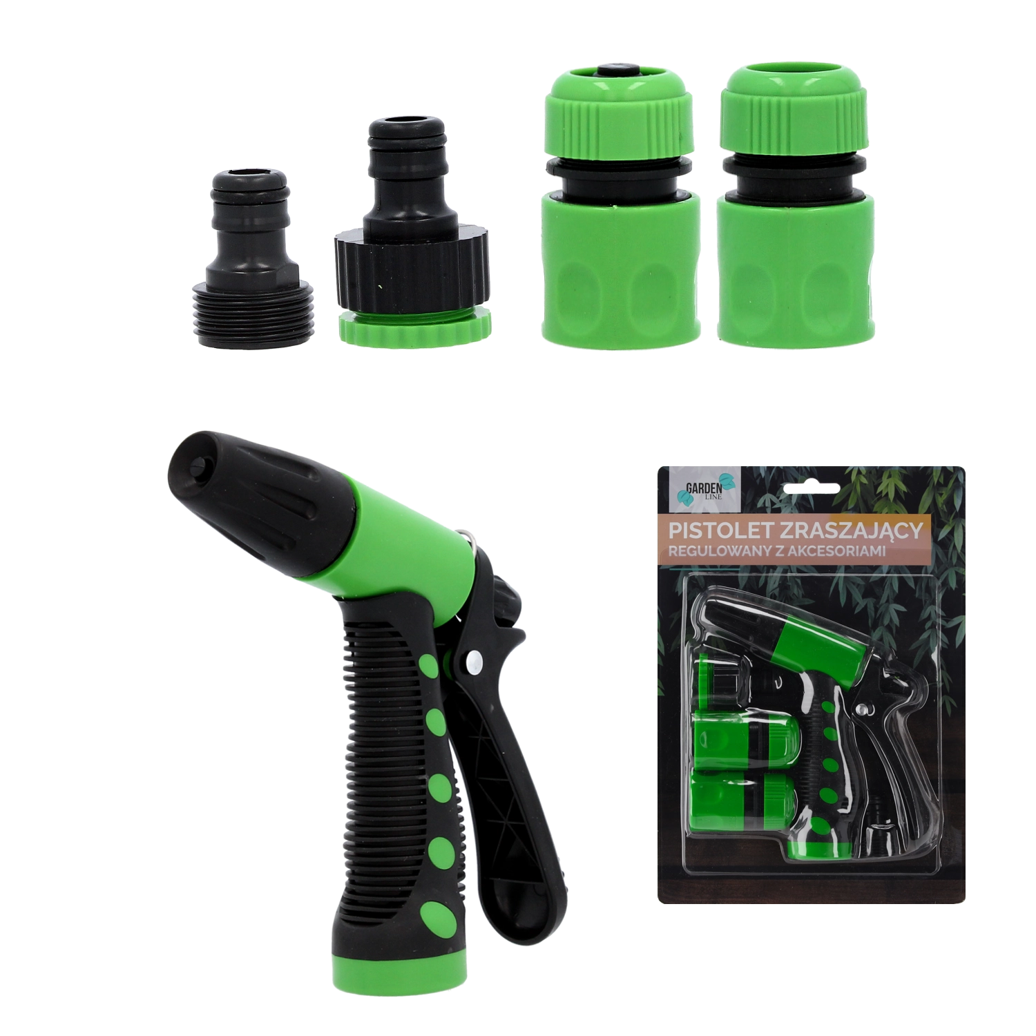 - Nastavljiva razpršilna pištola; hitra spojka 1/2" s stop funkcijo; hitra spojka 1/2" brez stop funkcije; adapter za pipo 1/2"–3/4"