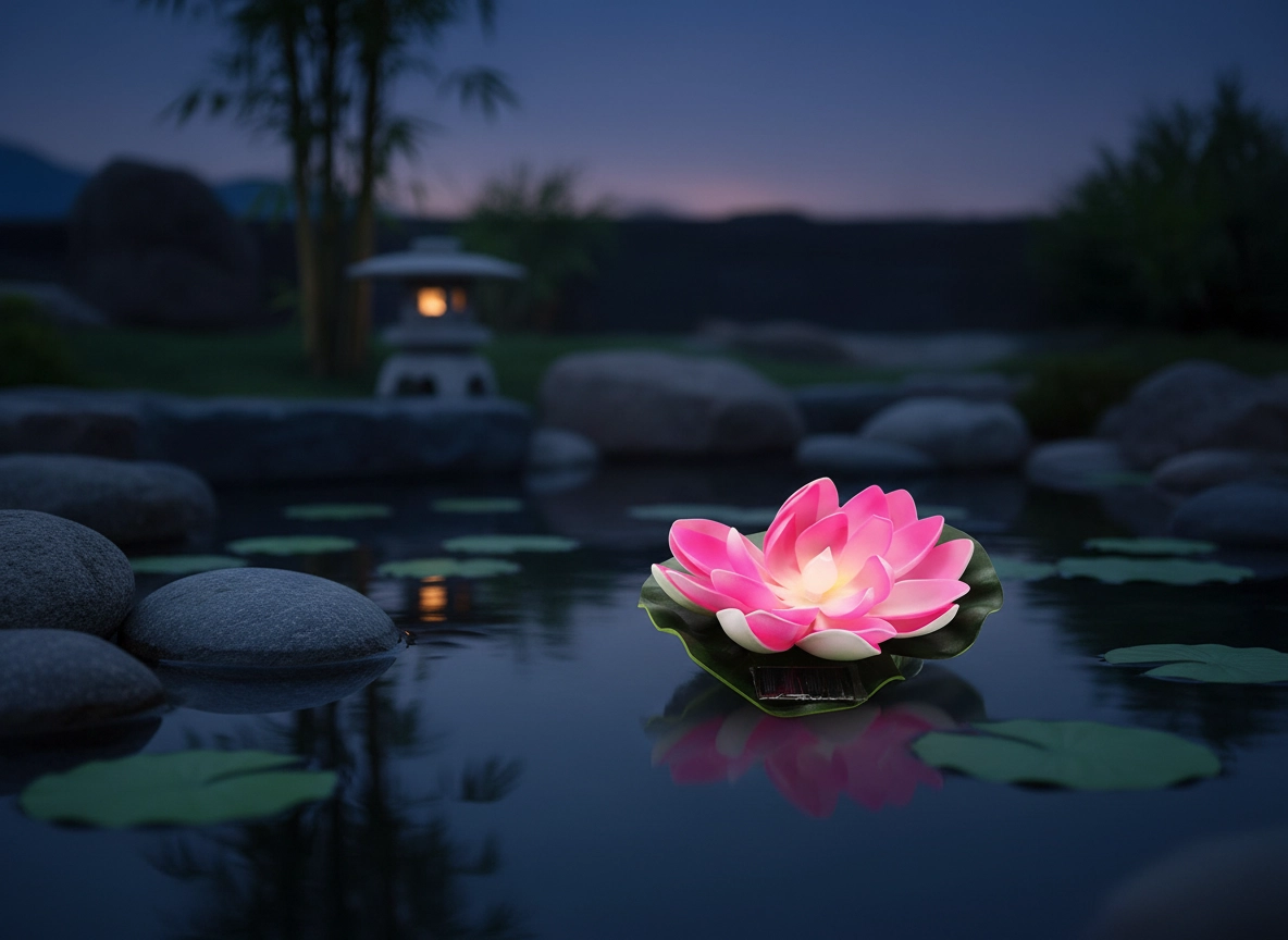 Dizajn z realističnimi cvetnimi listi in zelenim listom zagotavlja naraven videz ter stabilno plavanje na vodni gladini. Brezžična, okolju prijazna rešitev brez potrebe po vzdrževanju je popolna izbira za vrtne ribnike, manjše vodne površine in okrasne posode z vodo.