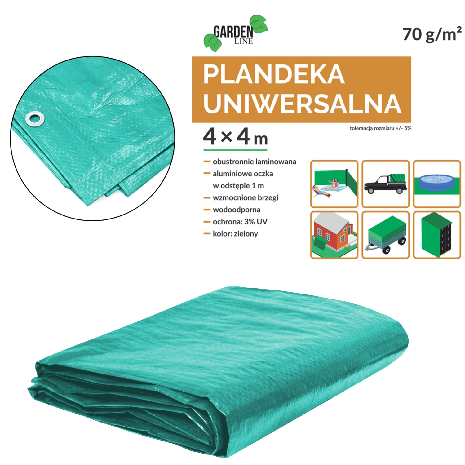 Univerzalna pokrivna ponjava iz kakovostnega PE z gramatura 70 g/m² ščiti pred dežjem, prahom in soncem. Je obojestransko laminirana, z ojačanimi robovi z vrvico in aluminijastimi očesi na vsakih 1 m. Zelena izvedba, UV zaščita 3 %, mere 4 × 4 m (+/−5 %).