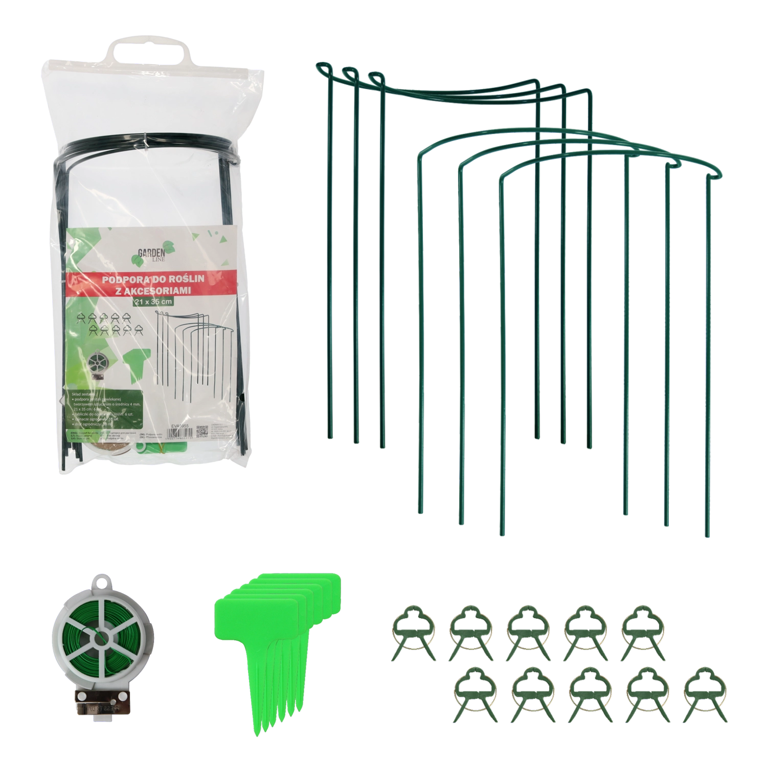 Praktična vrtna opora za rože in okrasne rastline iz trdnega jekla s plastično prevleko. Zaradi zelene barve je neopazna, hkrati stabilizira stebla in podpira skladen rast. Priložen je celovit komplet dodatne opreme za preprosto pritrjevanje in označevanje rastlin.