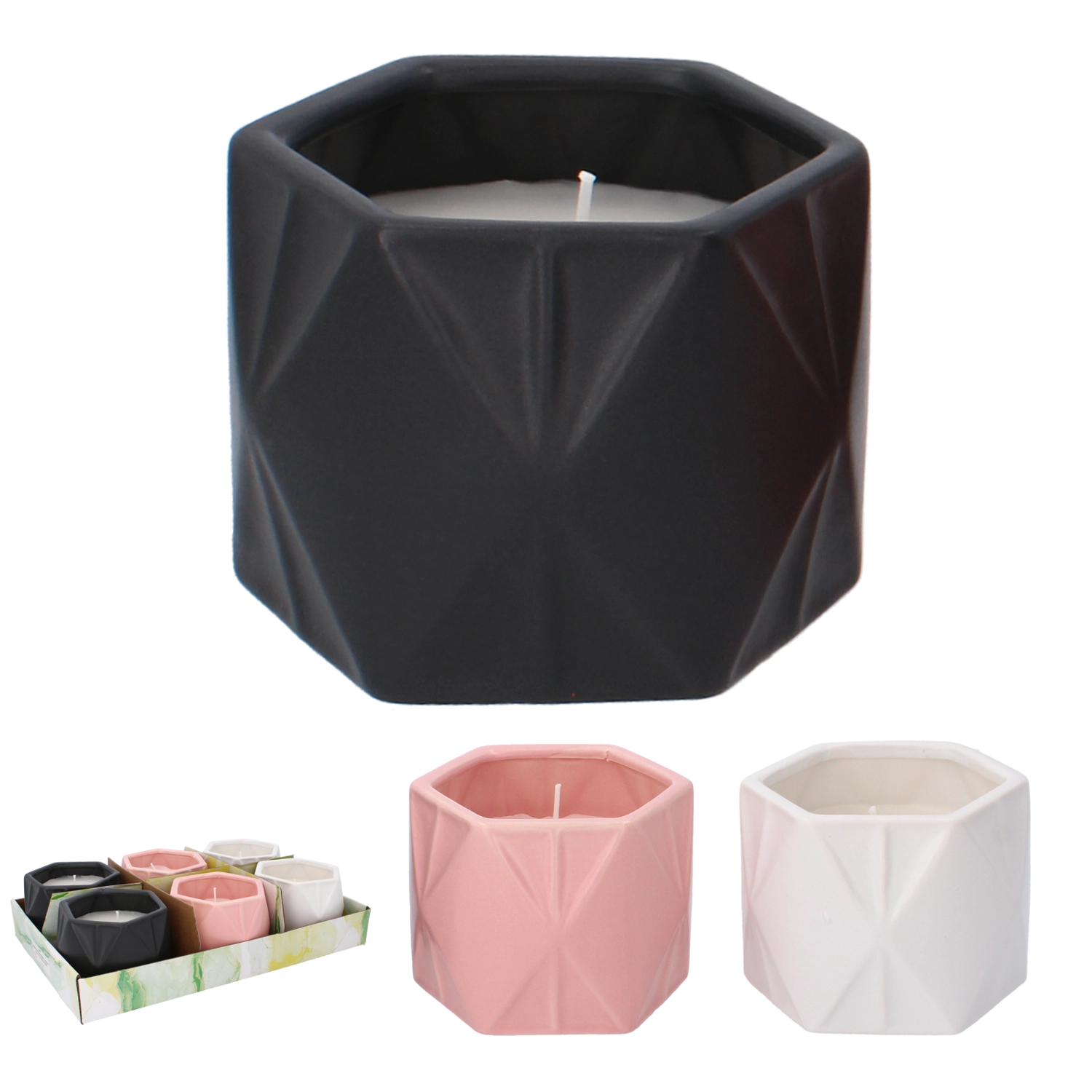 Ta dekorativna sveča v kakovostni keramični posodici odlično izgleda v vsakem prostoru in hkrati nudi praktično zaščito zaradi vonja citronela. Mešanico elegantnih barv (rožnata, bela, črna) zlahka uskladite z vašim domom ali vrtom.