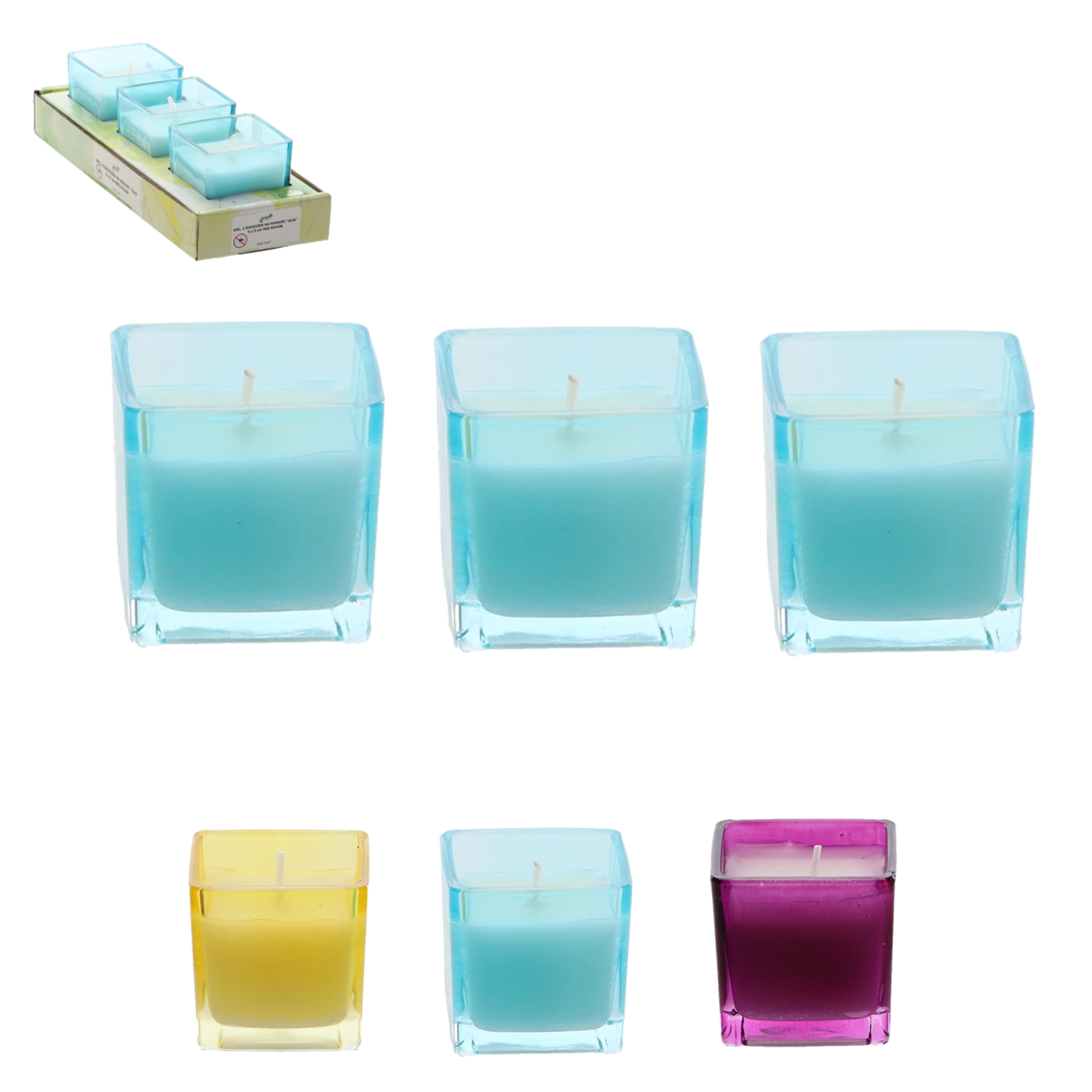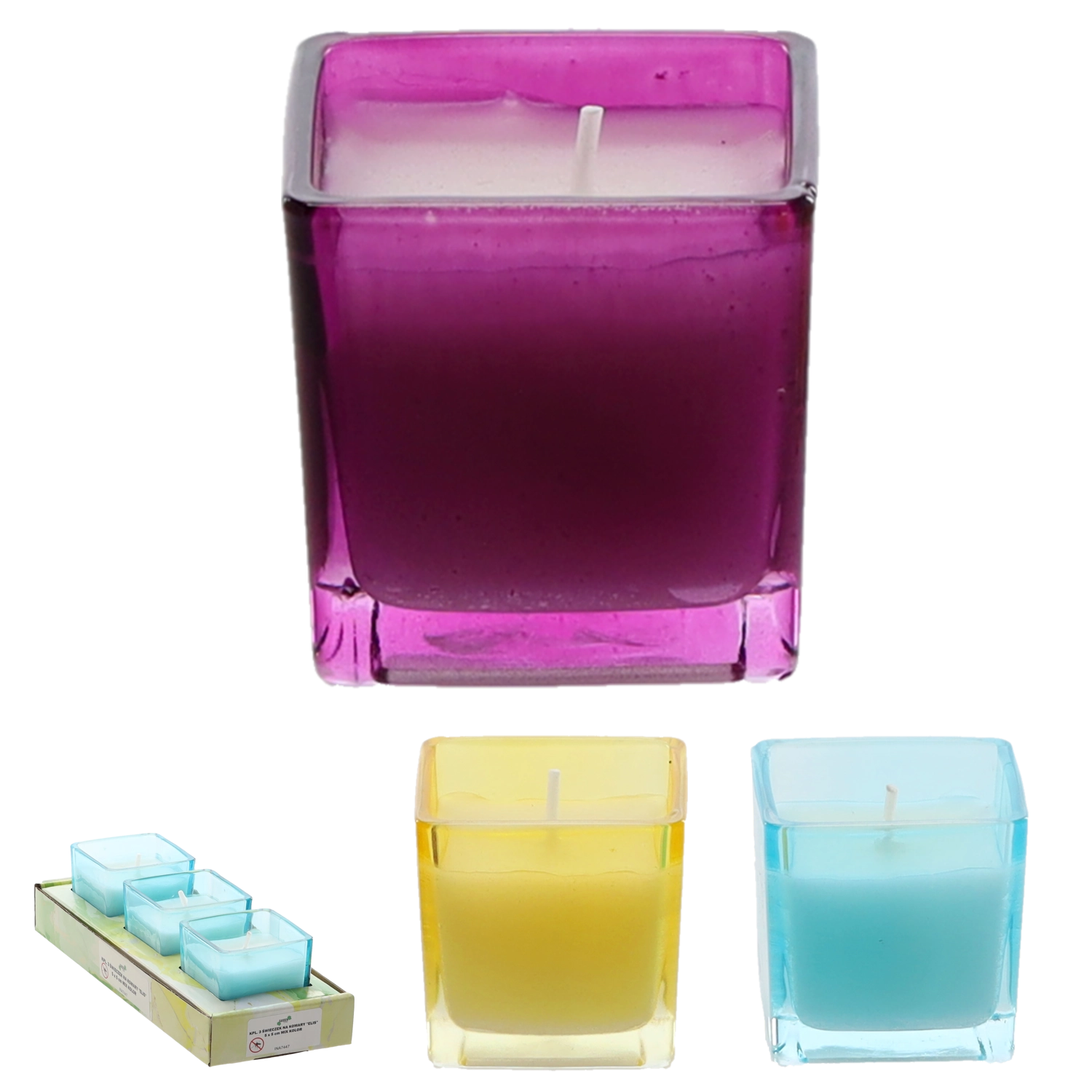 Elegantni set treh sveč v steklenih kozarčkih v barvah vijolična, modra in rumena. Vosek vsebuje eterično olje citronela, ki je znano po svojih odganjalnih učinkih proti komarjem. Kompaktna mera 5 x 5 cm je primerna za terase, balkone in notranje prostore.