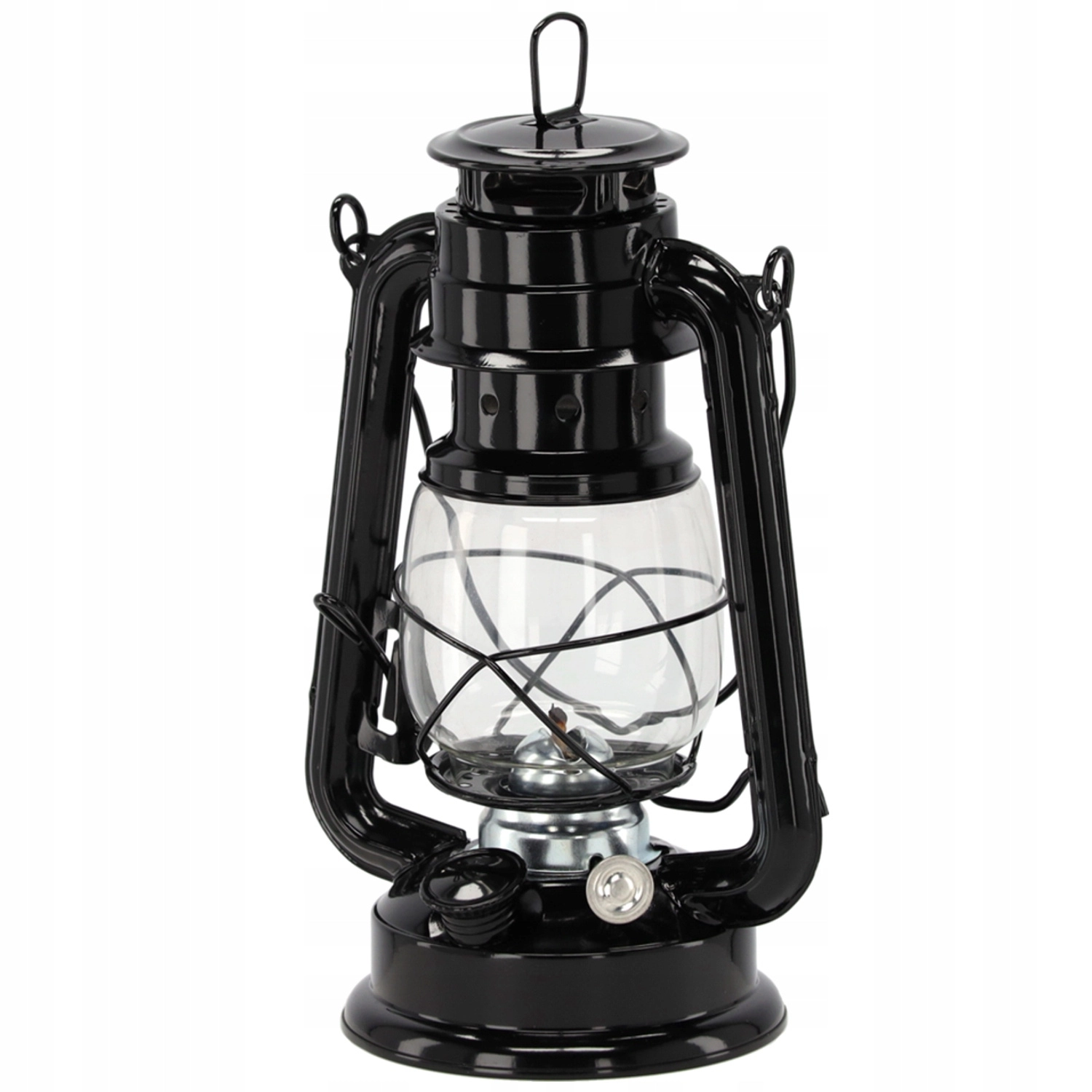 Ta kovinska petrolejka v črni barvi združuje brezčasen vintage videz s praktičnimi lastnostmi. Zahvaljujoč steklenemu cilindru in zaščitni žični košari je plamen zaščiten, medtem ko vrtljivo kolesce omogoča tekoče uravnavanje svetlosti. Robustni ročaj olajša prenašanje in obešanje.