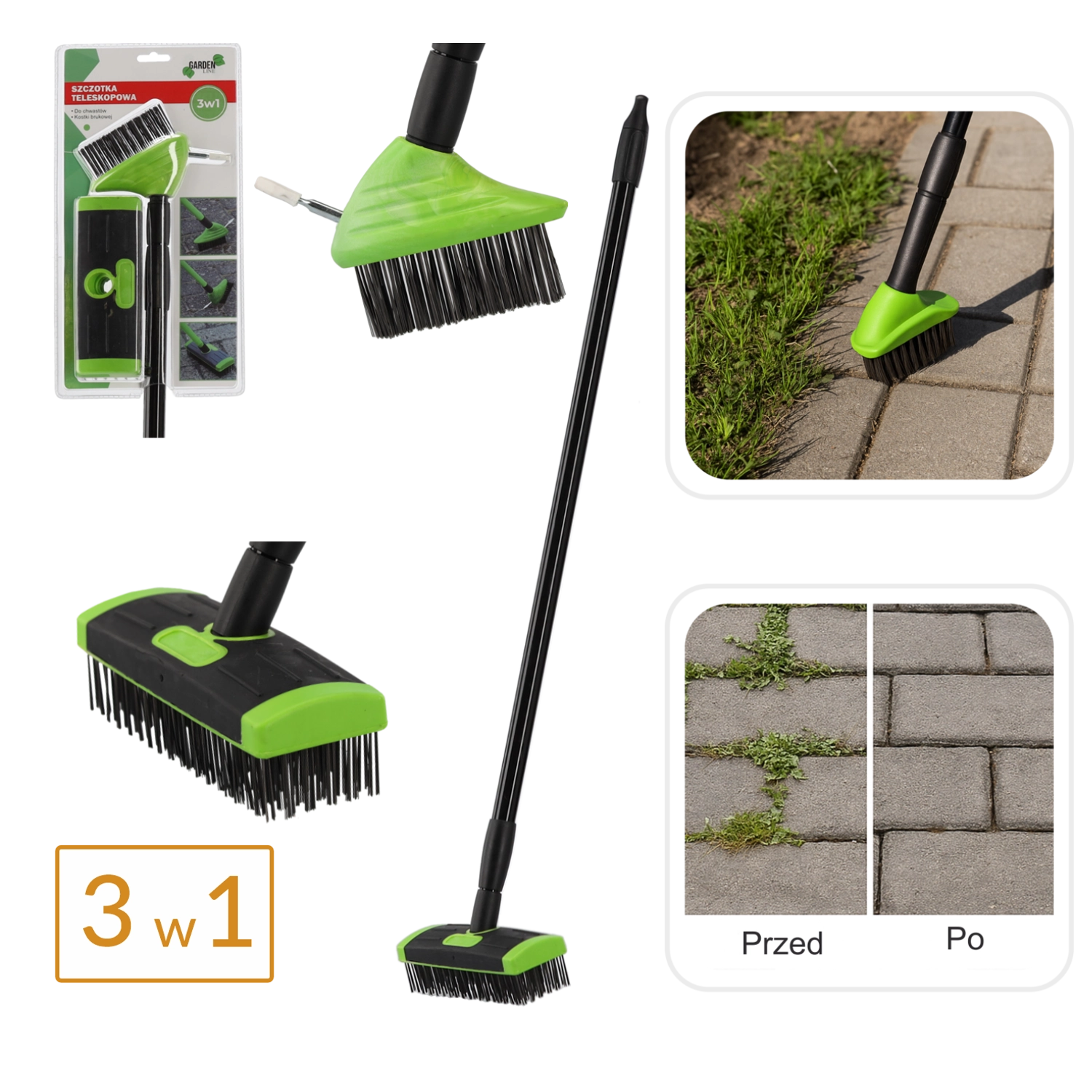 Praktični komplet 3v1 združuje tri zmogljive nastavke za temeljito čiščenje zunanjih površin. Toge žične ščetine z medeninastim premazom se spopadejo z nečistočami, mahom in plevelom brez kemije, medtem ko lahka in čvrsta teleskopska palica omogoča udobno delo stoje. Idealno za tlakovce, robnike, dvorišča in terase.