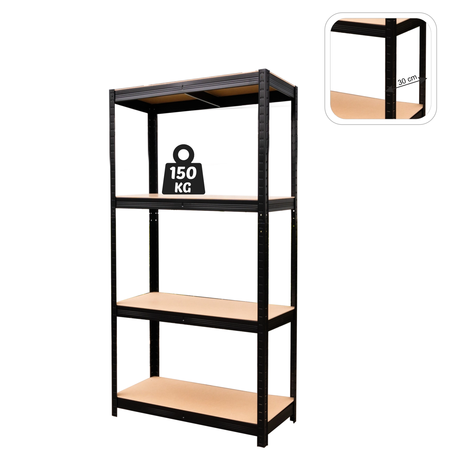 Polica je kot nalašč za garaže, delavnice, kleti, pisarne in domače shrambe. Ojačitve pod vsako polico povečujejo stabilnost in omogočajo varno obremenitev do 150 kg pri enakomerni porazdelitvi. Odprta konstrukcija omogoča pregleden dostop s treh strani in hitro organizacijo orodja, škatel ali zalog.