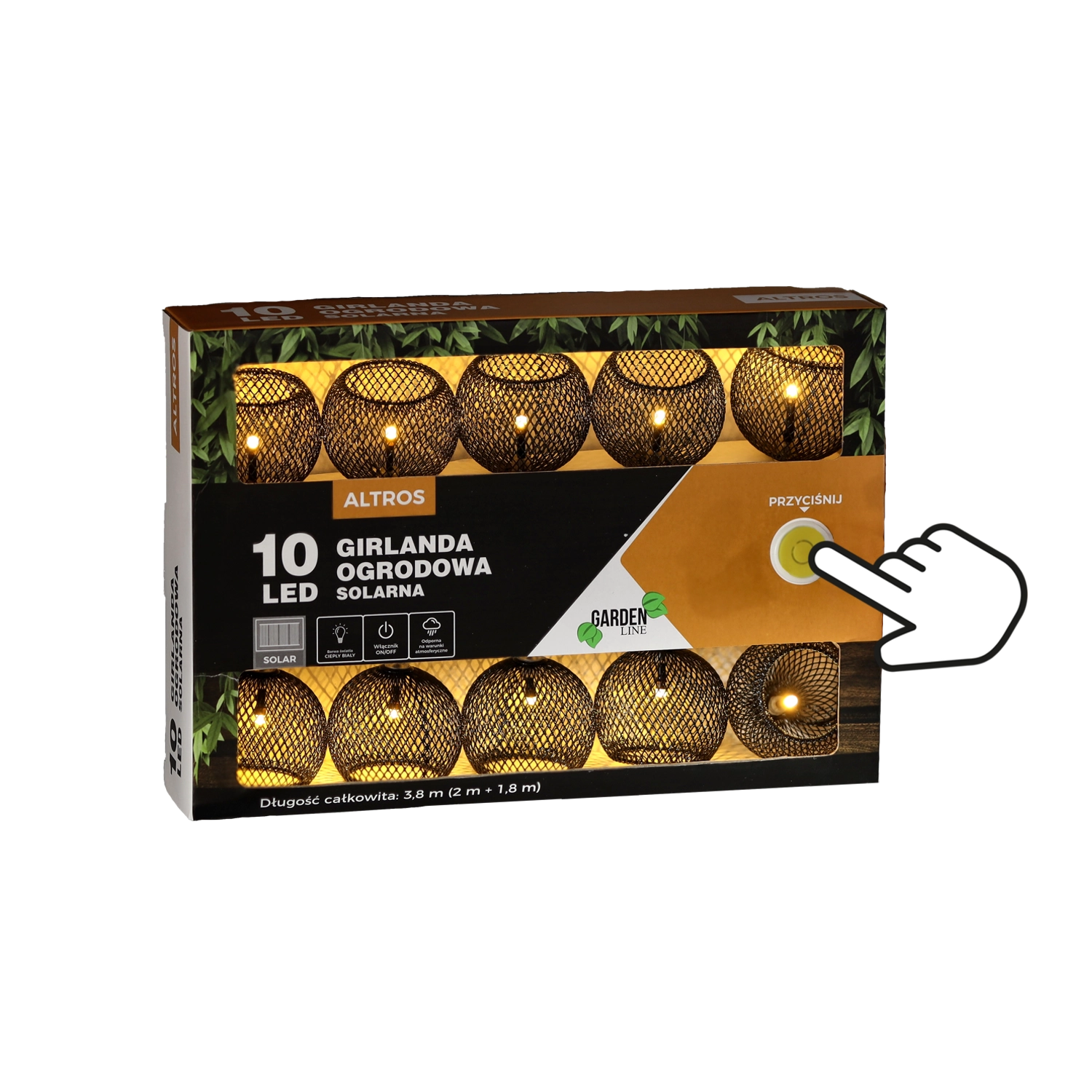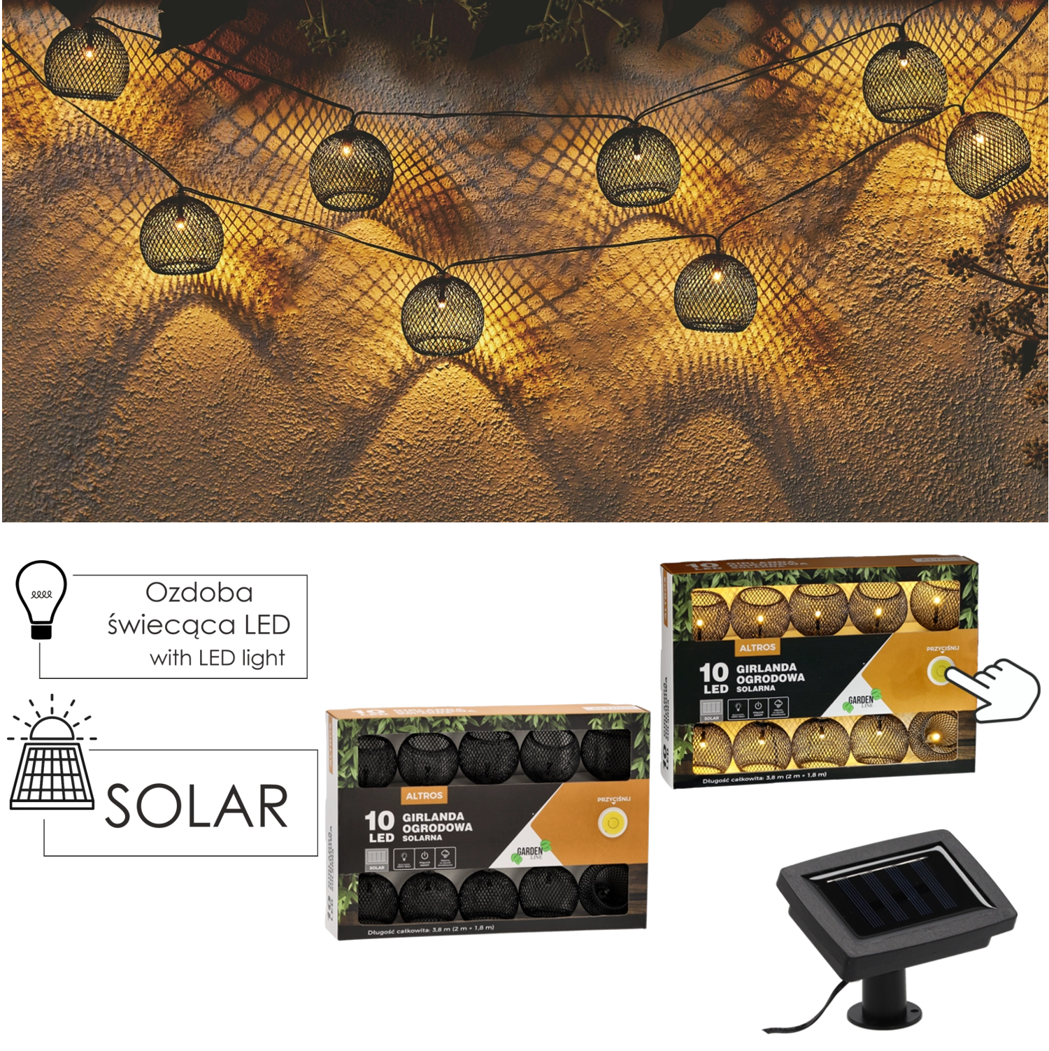 Stilska solarna girlanda ALTROS z 10 LED v toplo belem odtenku osvetli balkon, teraso in vrt. Zahvaljujoč solarnemu napajanju je povsem brez kablov in varčuje z energijo. Ponuja 2 načina svetenja (stalno/utripajoče), vodoodpornost IP44 in skupno dolžino 3,8 m za enostavno okraševanje.