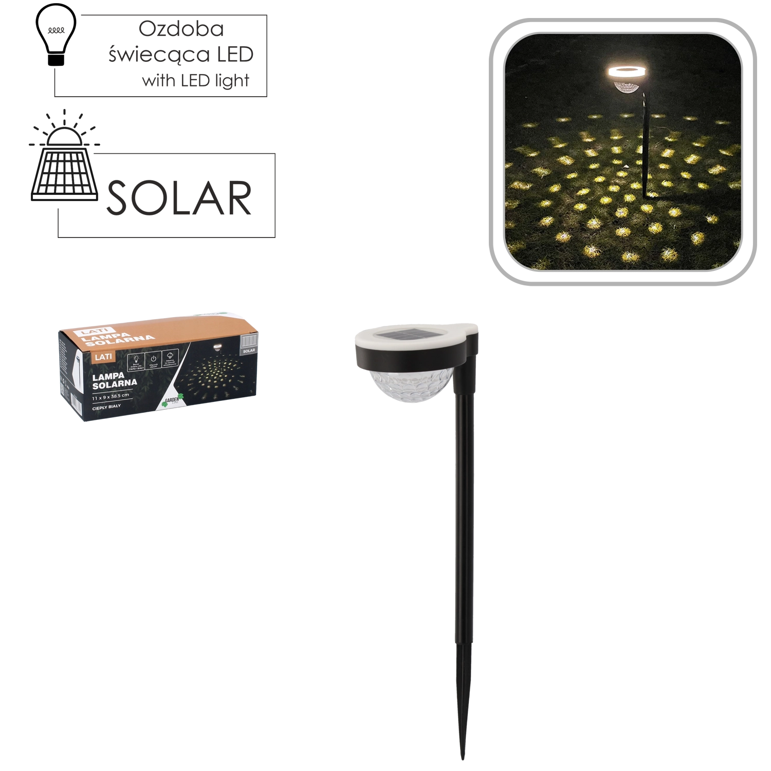 Solarna vrtna LED svetilka LATI združuje moderen dizajn in praktično funkcionalnost. Vgrajen sončni panel čez dan polni vgrajeni akumulator, po mraku pa svetilka samodejno zasveti s prijetno toplo svetlobo, ki ustvarja dekorativne učinke navzgor in navzdol. Idealna za osvetlitev poti, dovozov, teras, gredic in vodnih elementov.