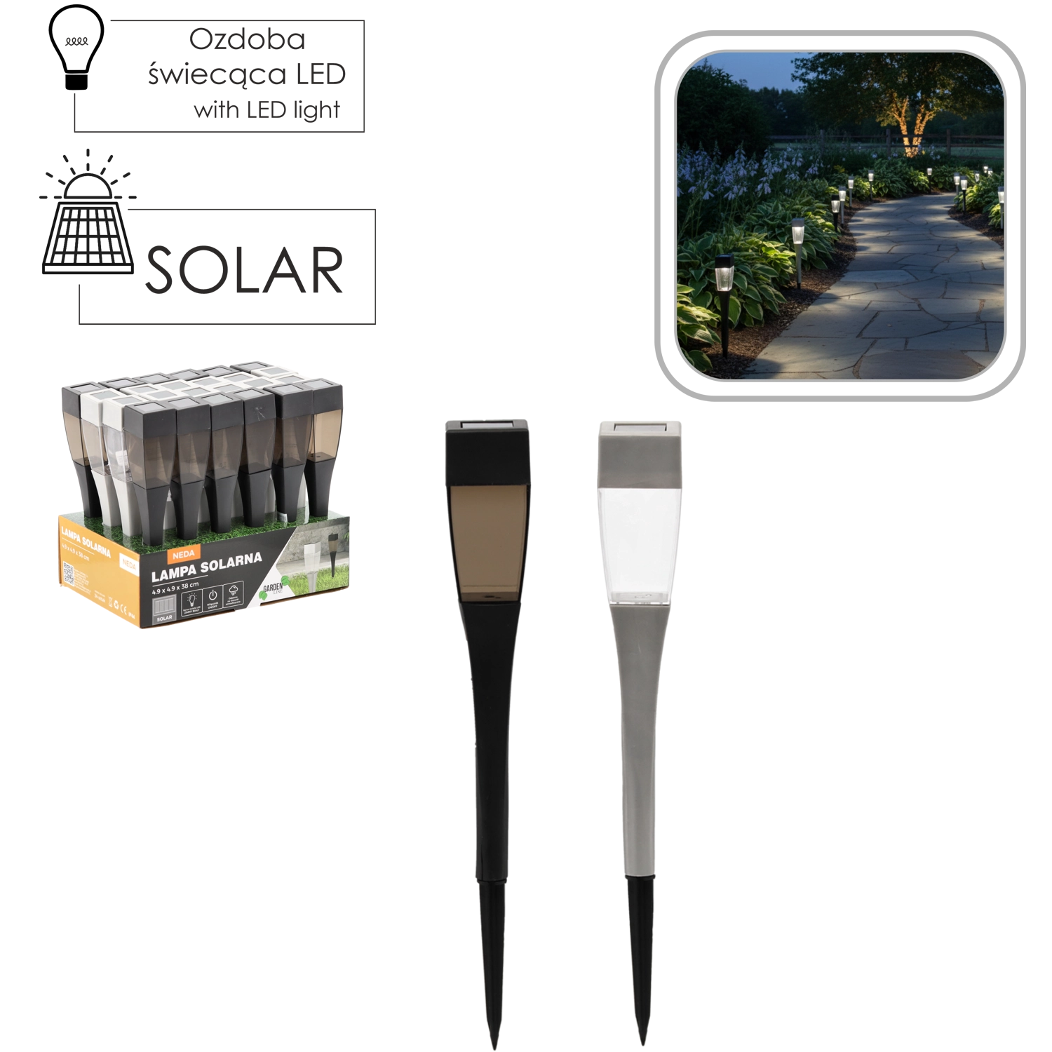Stilska solarna vrtna LED svetilka Neda prinaša brezžično osvetlitev za poti, dovozne ceste, terase in gredice. Zahvaljujoč solarnemu napajanju in samodejnemu delovanju po mraku sveti s hladno belo svetlobo, je odporna na vremenske vplive (IP44) in se enostavno namesti z zabodom v zemljo.
