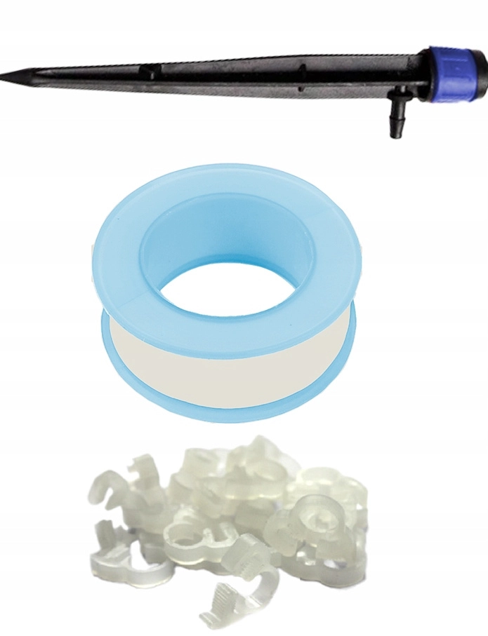 V paketu so cevi 9×12 mm in 3×5 mm, spojke, T-kosi, koleno, zaključki, hitra spojka, priključek za pipo, 15 kapljačev in 15 sponk za preprosto pritrditev vodov. Teflonski trak pomaga popolno zatesniti navojne spoje in preprečiti izgube.