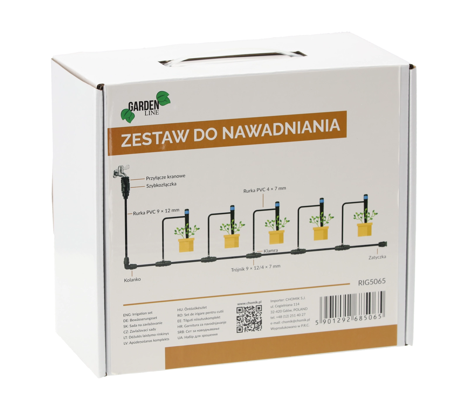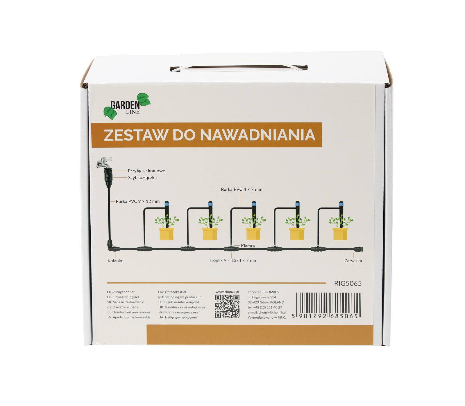 Vse potrebno v eni škatli: kapljači, cevi, spojke, T-kosi, zaključki in teflonski trak. Sestavite in zaženete v nekaj trenutkih.