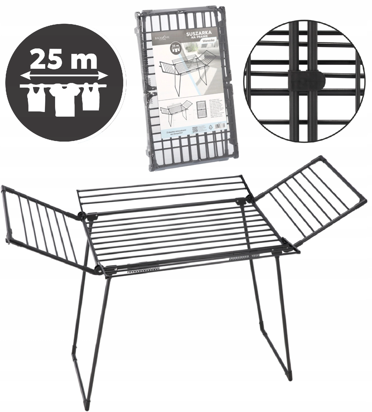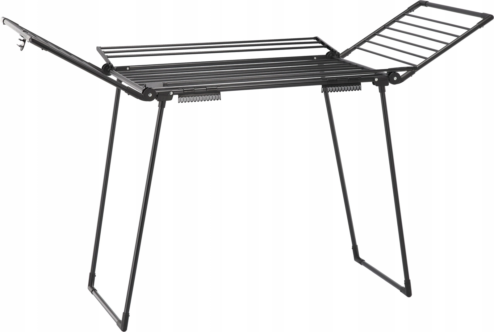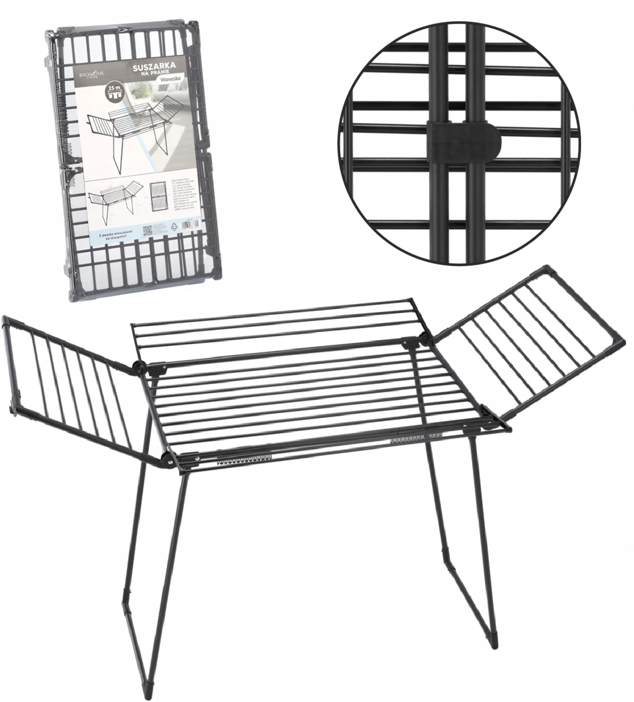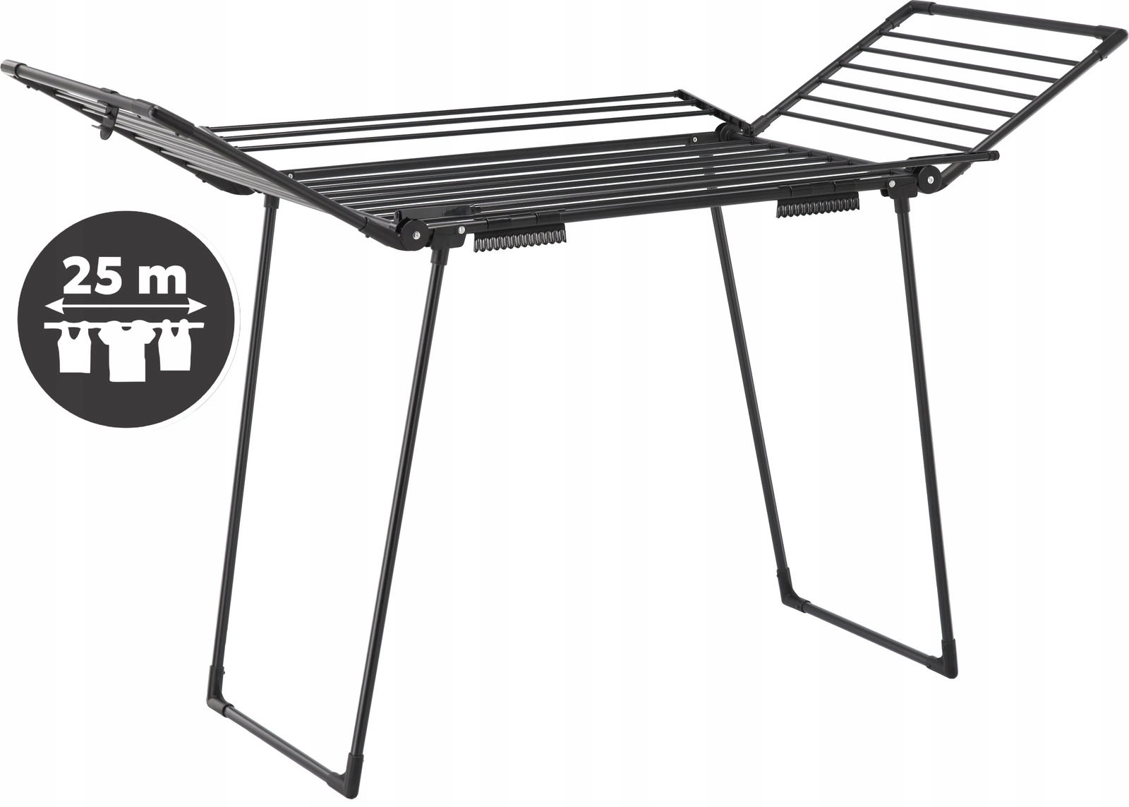 Praktično stojalo Waneska ponuja veliko sušilno površino zahvaljujoč štirim rokam in preklopnim krilom. Zaradi robustnega jeklenega okvirja s praškastim lakom v mat črni barvi prenese vsakodnevno uporabo doma ali na balkonu. Dva integrirana držala za nogavice ohranjata drobne kose perila pregledno in brez ščipalk.