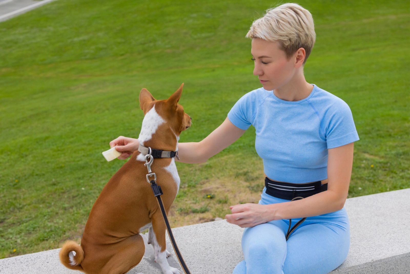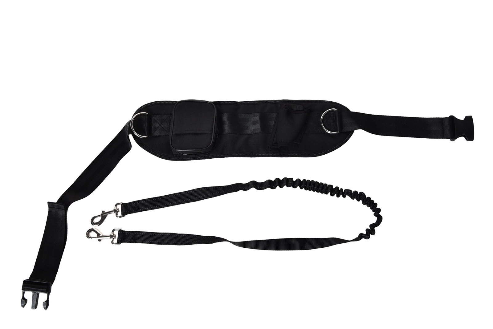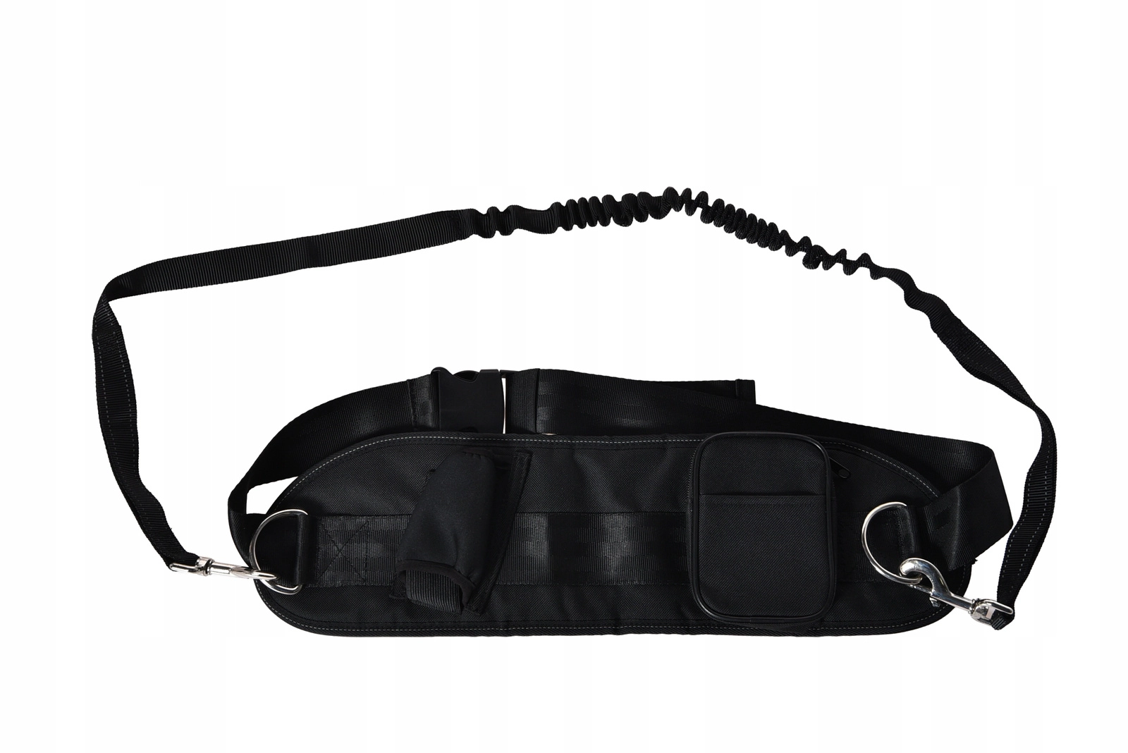 Pas ima tri praktične žepe – varen žep na zadrgo za telefon in dokumente, držalo za steklenico in hitro dostopen žep z ježkom na primer za priboljške. Odsevni elementi povečujejo vidnost pri večernem teku, za večjo brezskrbnost pa lahko povodec kadarkoli odklopite od pasu in ga uporabite samostojno.