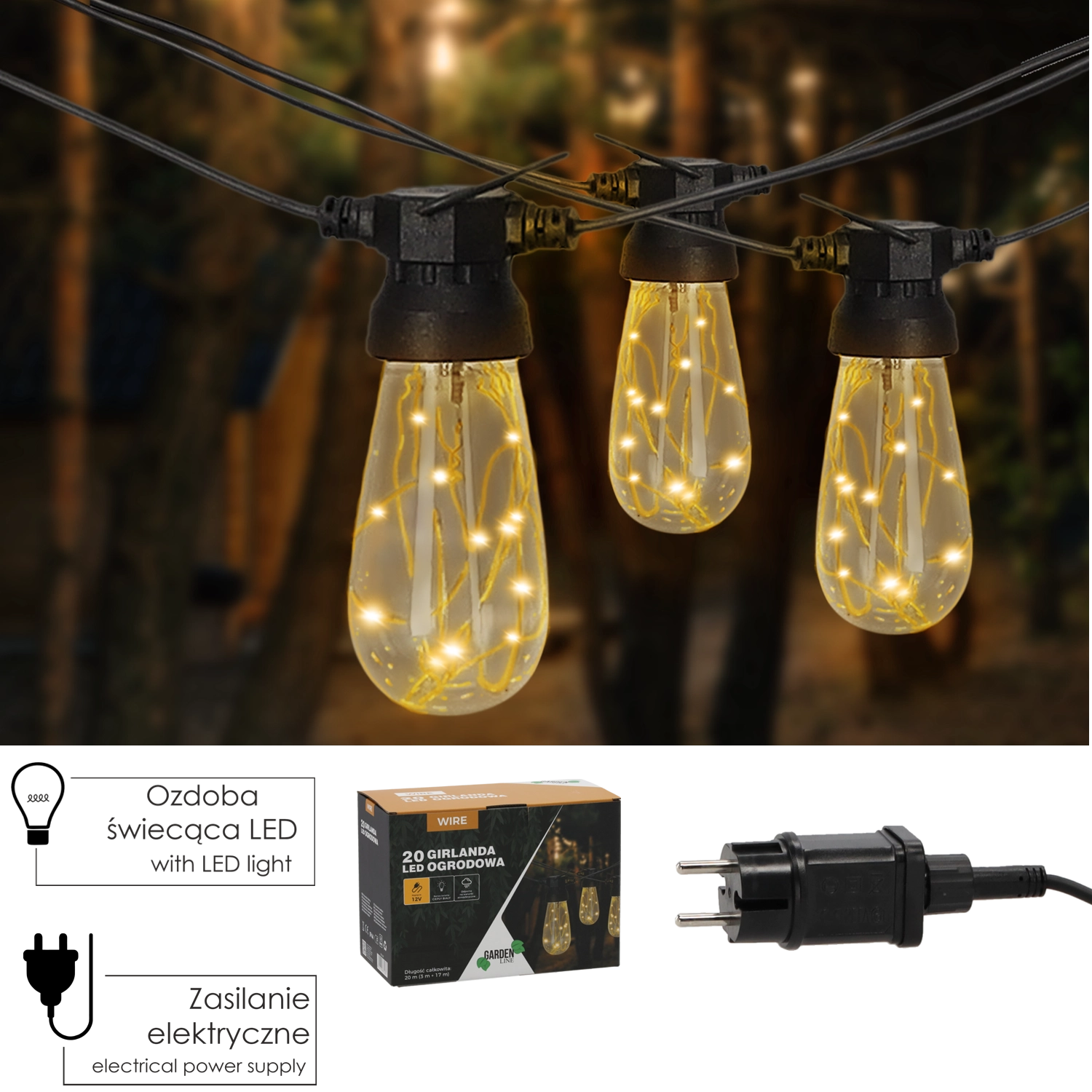 Ta vrtna svetlobna veriga združuje moderen in brezčasen videz s prijetno toplo svetlobo, ki ustvari domačno vzdušje pri druženju ali praznovanjih. Skupna dolžina 20 m (3 m napajalnega kabla + 17 m z žarnicami) z razmiki približno 0,85 m zagotavlja enakomerno osvetlitev brez ostrih senc.