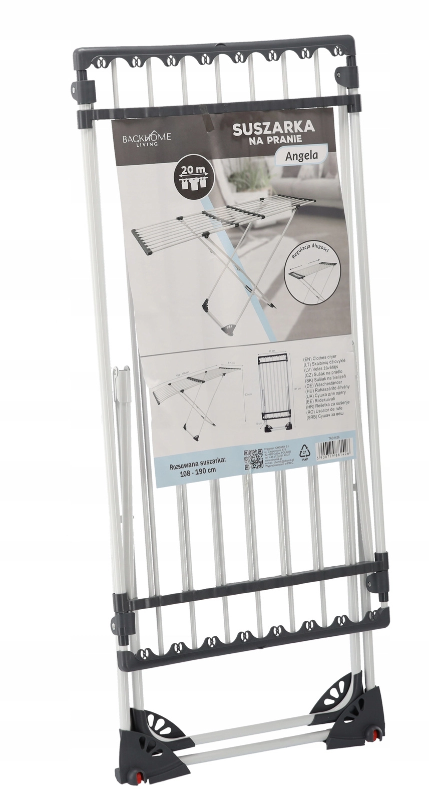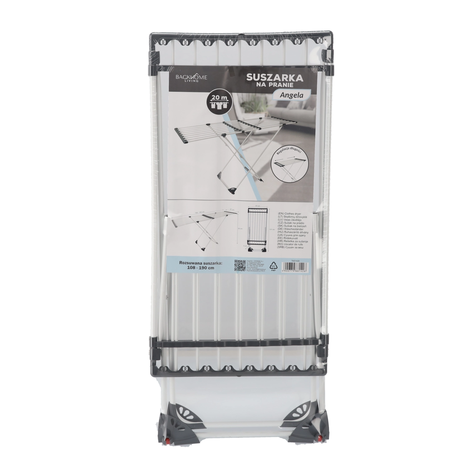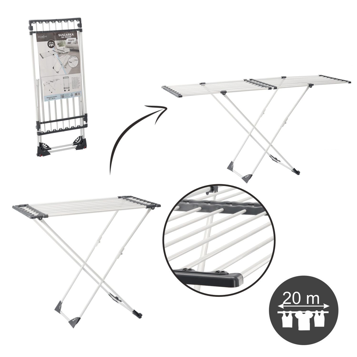 Praktično stojalo za sušenje perila Angela je idealno za vsak dom. Ponuja nastavljivo dolžino 108–190 cm, zložljiva stranska krila za več prostora in stabilno, proti koroziji odporno konstrukcijo za dolgo življenjsko dobo. Po zlaganju je kompaktno in enostavno za shranjevanje.