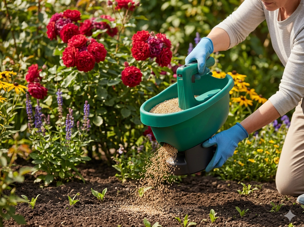 Intuitivni upravljalnik omogoča natančno nastavitev količine doziranja in hitrosti vrtenja, tako da material pristane točno tam, kjer mora. Trpežno plastično ohišje je lahko, prenosno in primerno za celoletno uporabo na gredicah, tratah in dovoznih poteh.