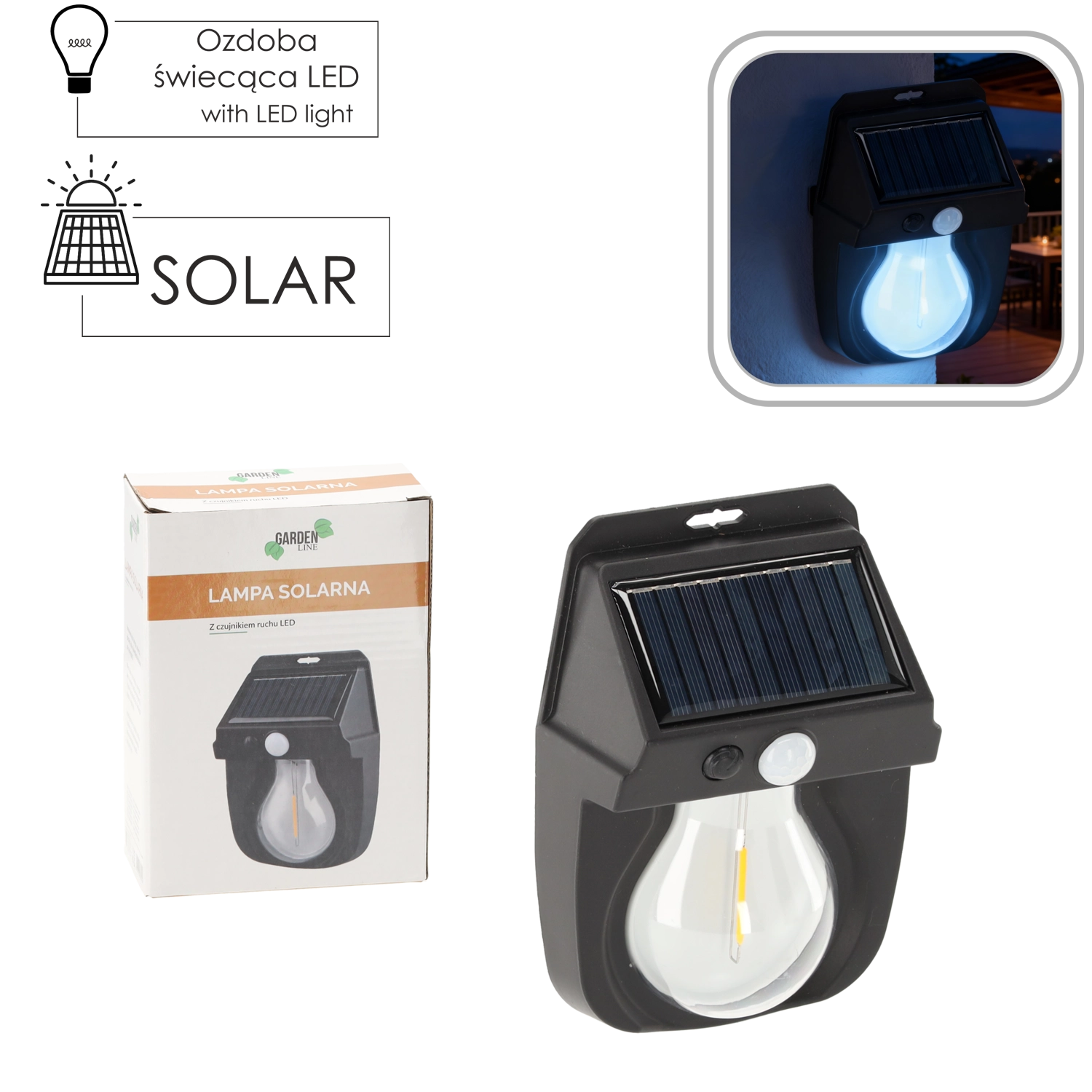 PIR senzor gibanja in somrakov senzor poskrbita, da svetilka sveti le takrat, ko je tema in je zaznano gibanje. Varčuje z energijo in povečuje varnost okoli vhoda ali garaže.