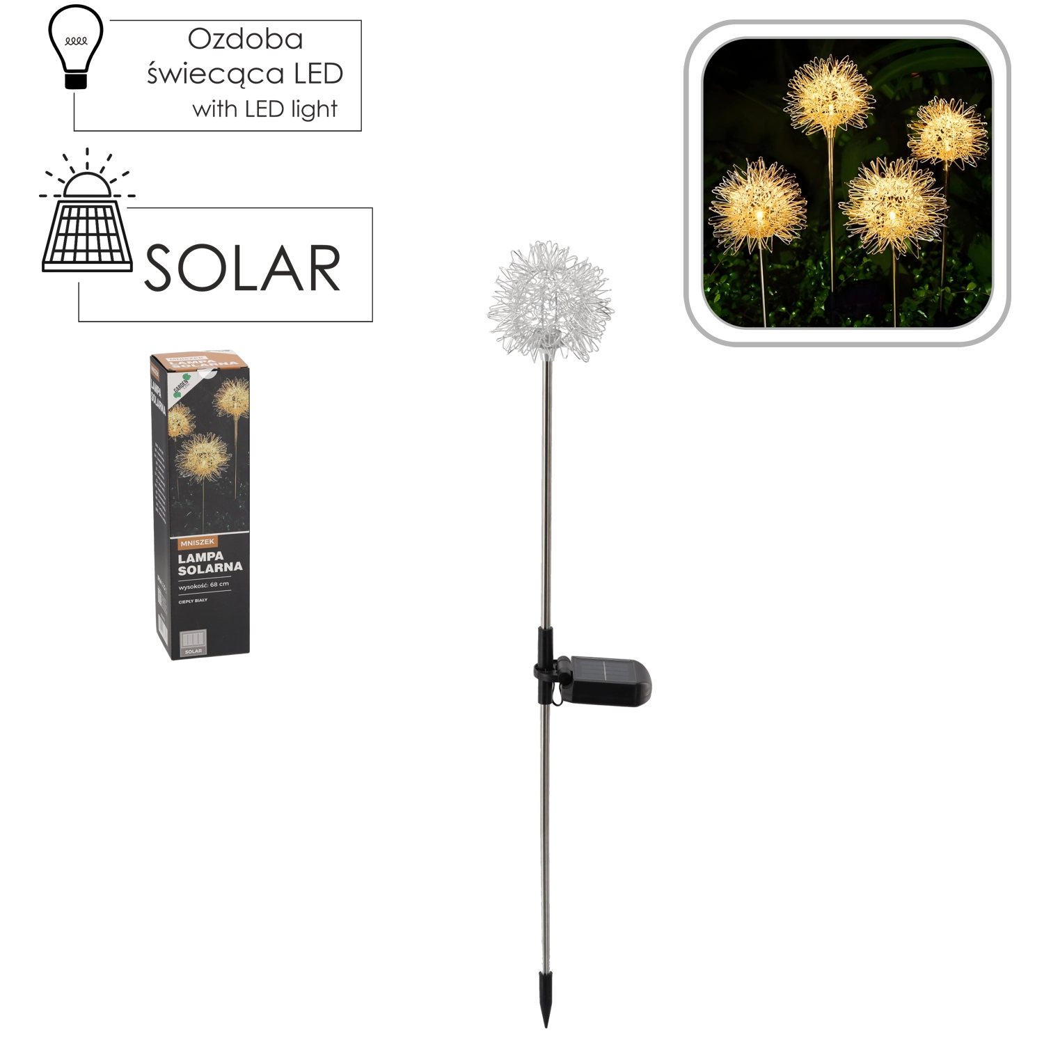 Sončna svetilka v obliki regrata, visoka 68 cm, v zunanjost prinaša nežno vzdušje in učinkovit dekor. Polikristalni sončni panel čez dan polni baterijo, po mraku pa zasveti 1 toplo bela LED, ki ustvari prijetno svetlobo brez porabe elektrike.