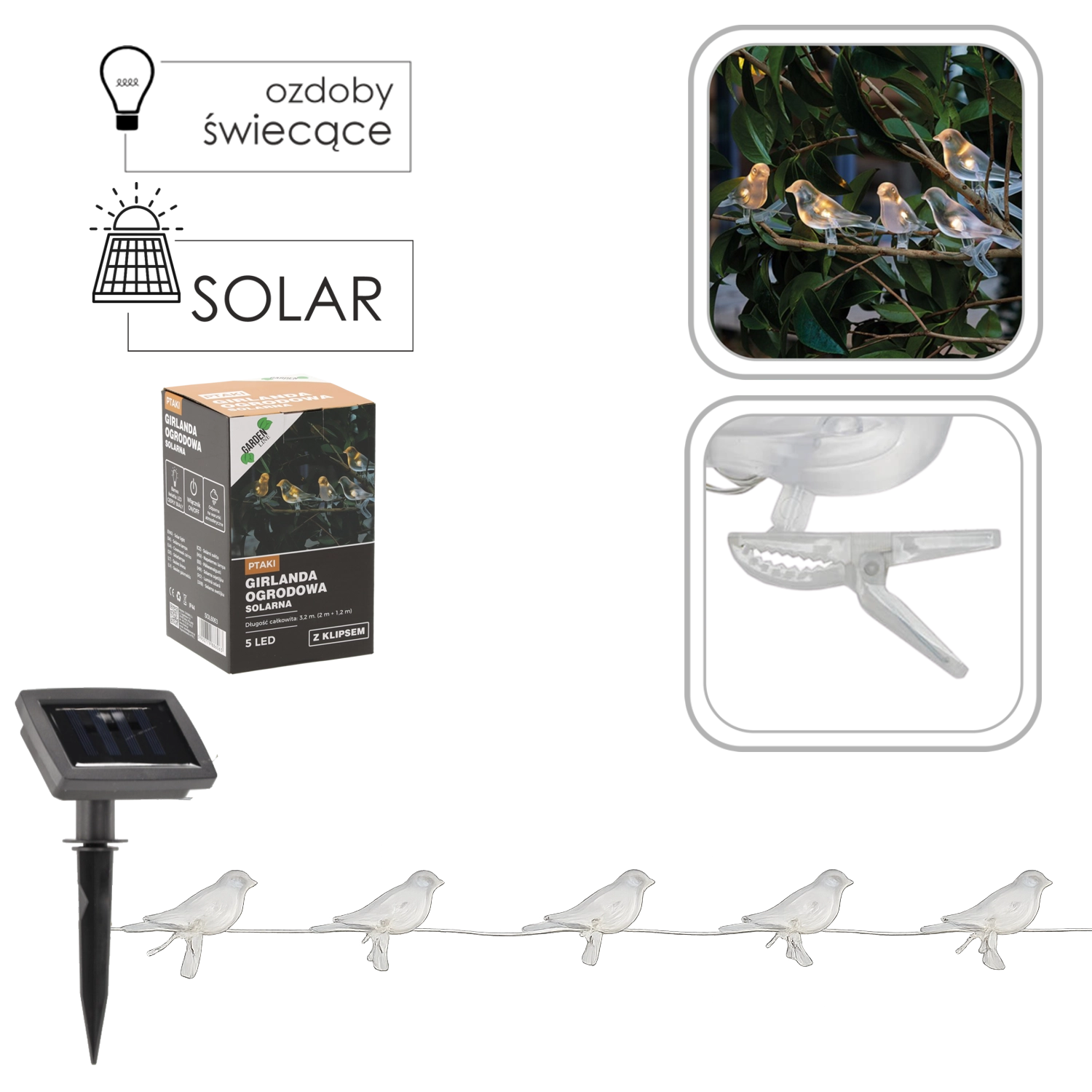 - Sončna LED girlanda z dekorativnimi ptički na sponkah