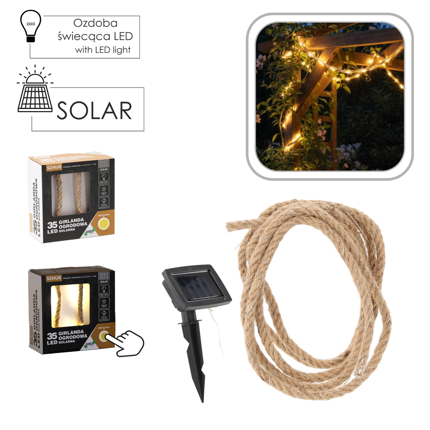 Stilska sončna svetlobna girlanda z 35 toplimi belimi LED čudovito osvetli vaš balkon, teraso in vrt. Zahvaljujoč sončnemu napajanju ne potrebuje vtičnice niti dodatnih stroškov za obratovanje. Ponuja 2 načina svetenja (neprekinjeno svetenje ali utripanje), je odporna na vremenske vplive IP44 in zahvaljujoč skupni dolžini 4 m zlahka okrasi pergolo, ograjo ali rastlinske kompozicije.