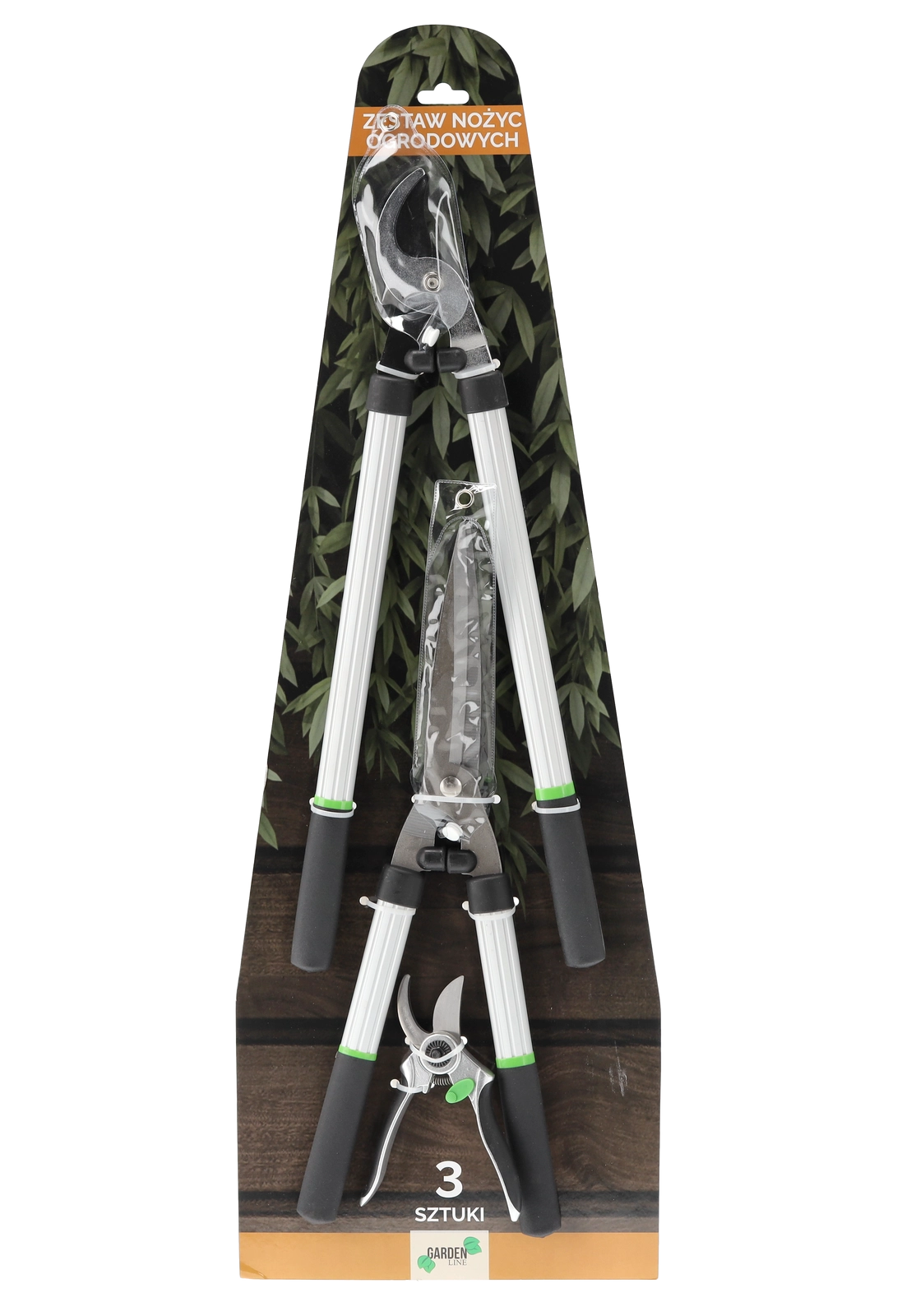 V paketu dobite: vzvodne škarje za veje (54 cm) z velikim vzvodom za čist rez živega lesa, škarje za živo mejo (51 cm, dolžina rezila 20 cm) za enakomerno oblikovanje ter kompaktne bypass ročne škarje za hiter in natančen rez stebel in manjših vejic.