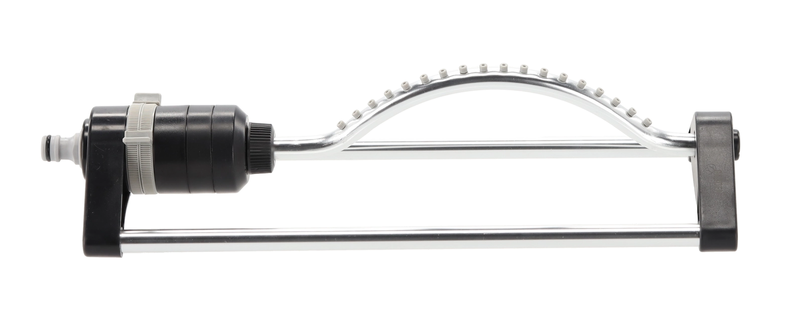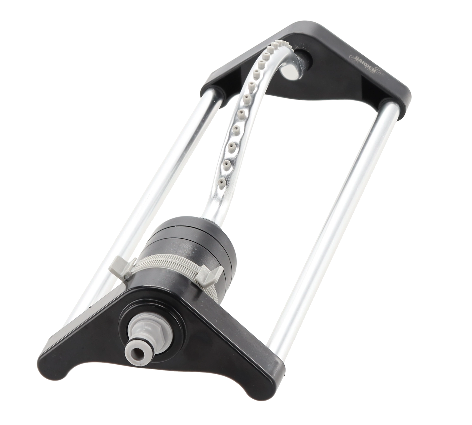 Preprosto se priključi na običajno vrtno cev s 3/4" priključkom. Vrtljivo in pretočno upravljanje omogoča prilagoditev širine in dosega pršenja glede na velikost površine. Stabilno kovinsko podnožje zagotavlja trden položaj tudi pri višjem pretoku 700–1100 l/h.