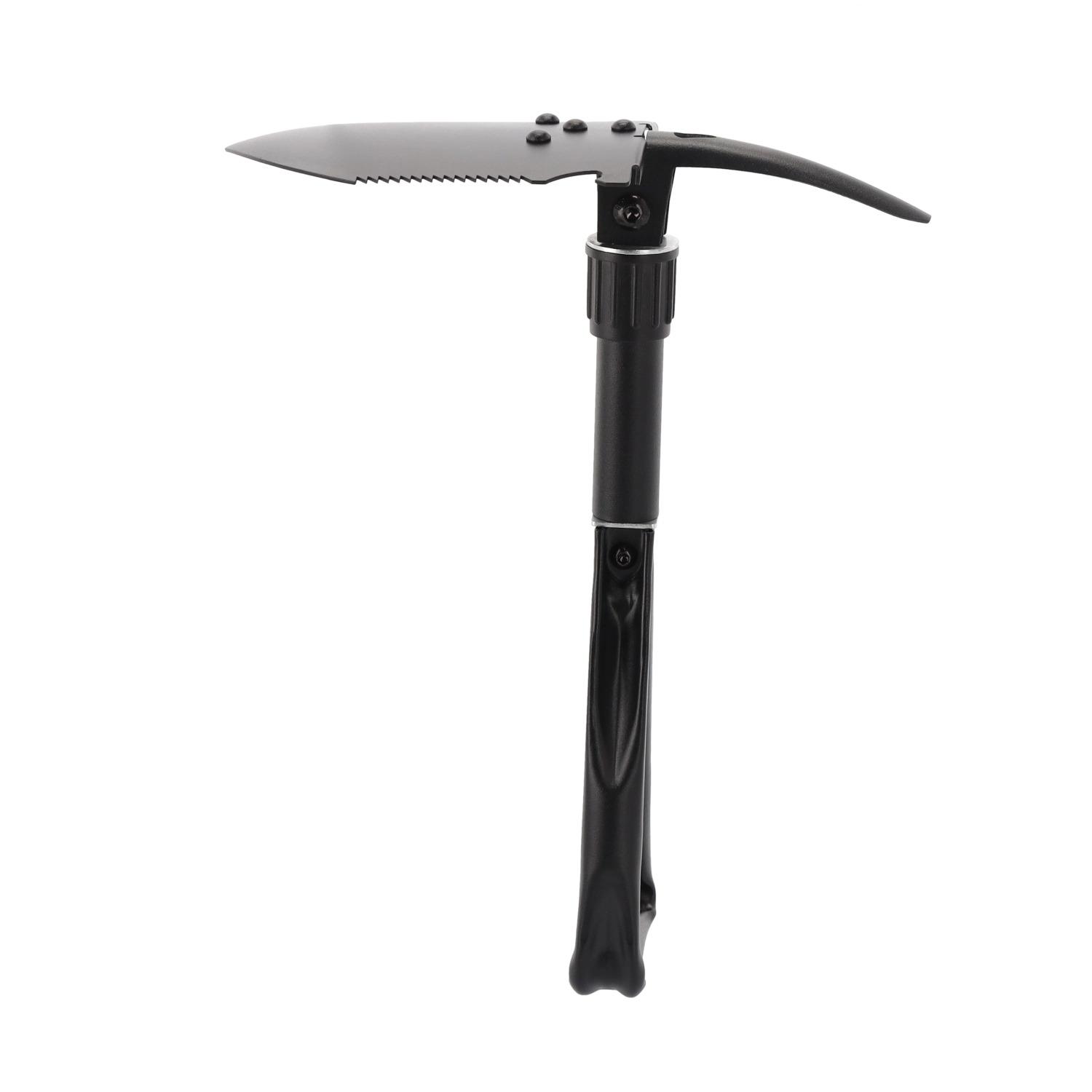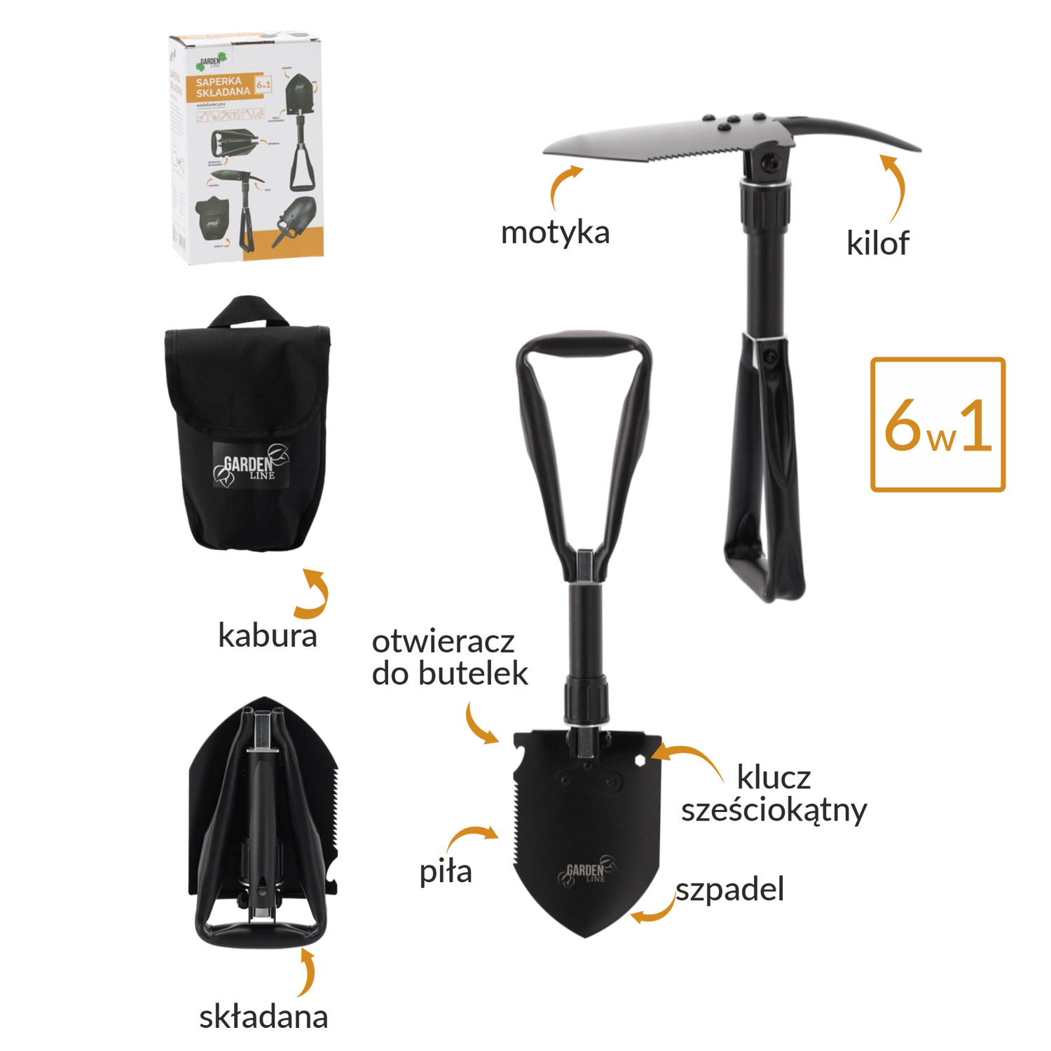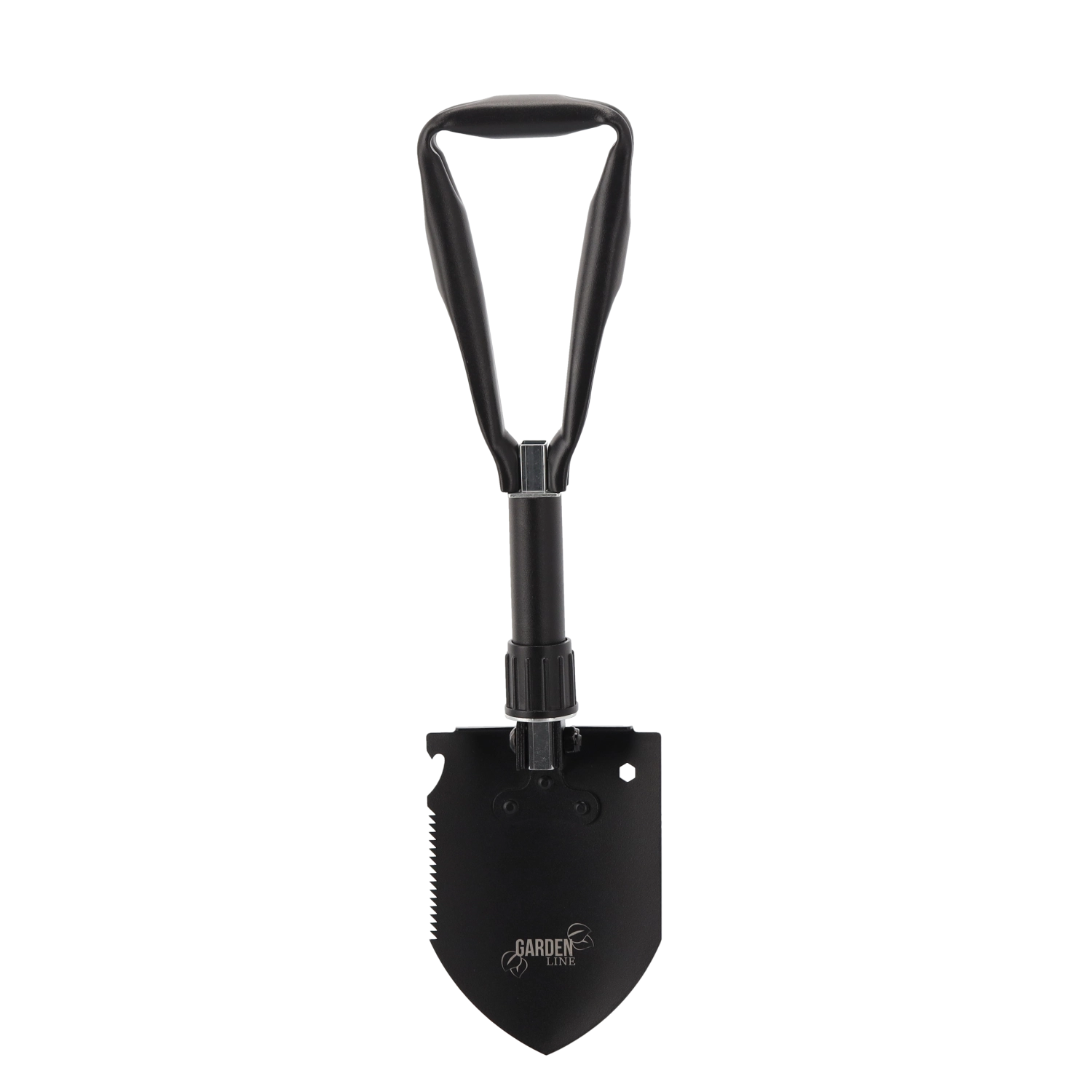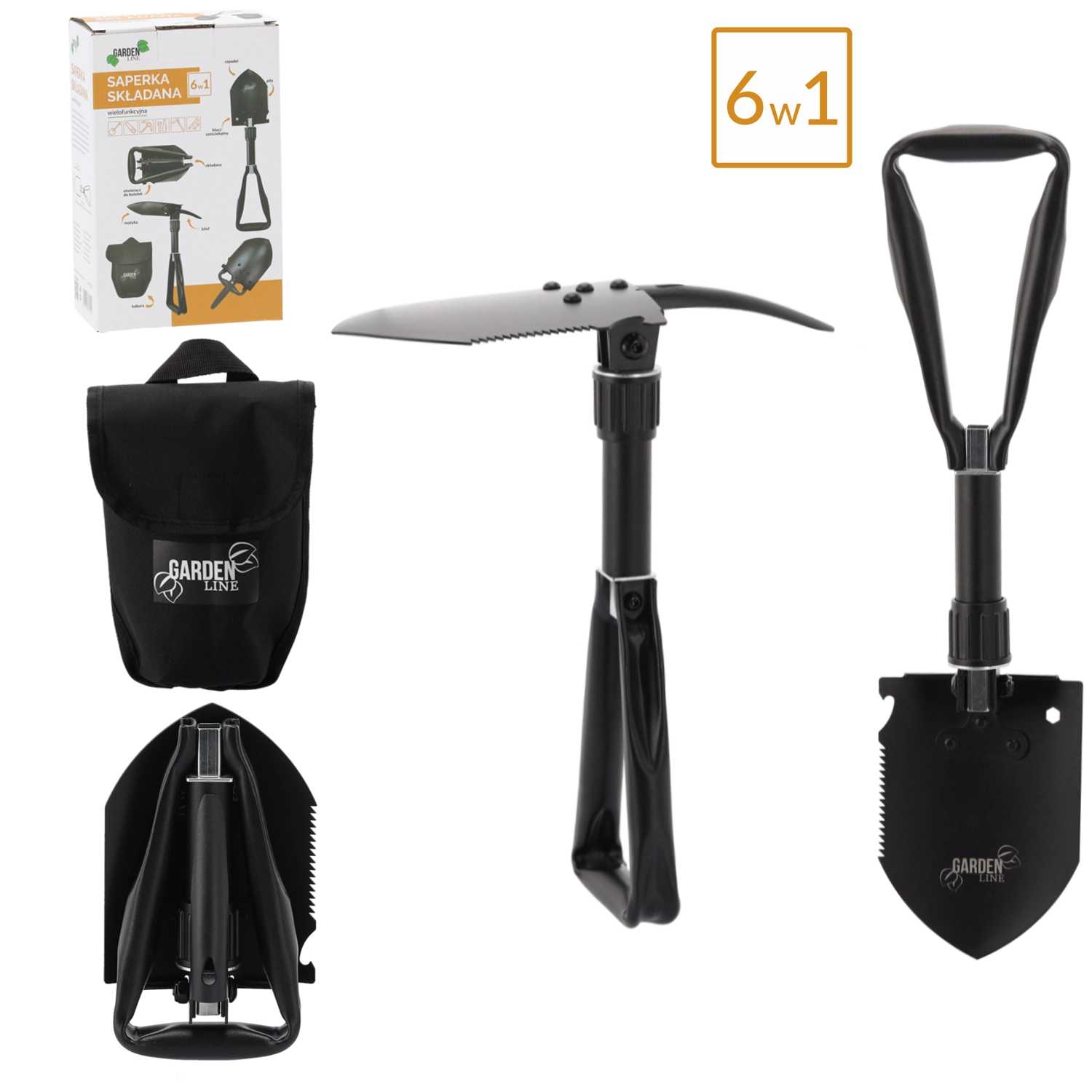 Ta vzdržljiva zložljiva lopata združuje lopato, motiko, žago, kramp, imbus ključ in odpirač za steklenice v enem orodju. Obvlada kopanje, razbijanje tal, rezanje korenin in vej ter drobna opravila na prostem. Rezilo iz manganovega jekla z žagastim robom in zaklepnimi tečaji zagotovi stabilnost pri obremenitvi.