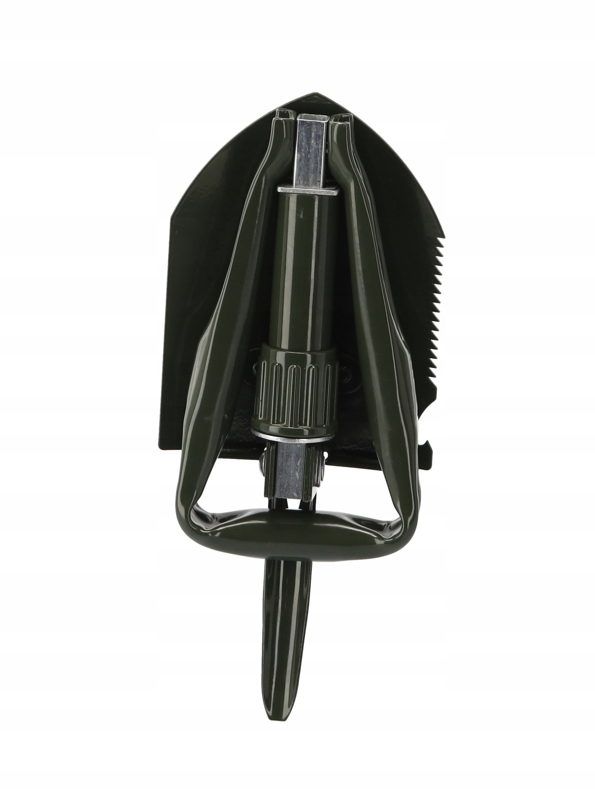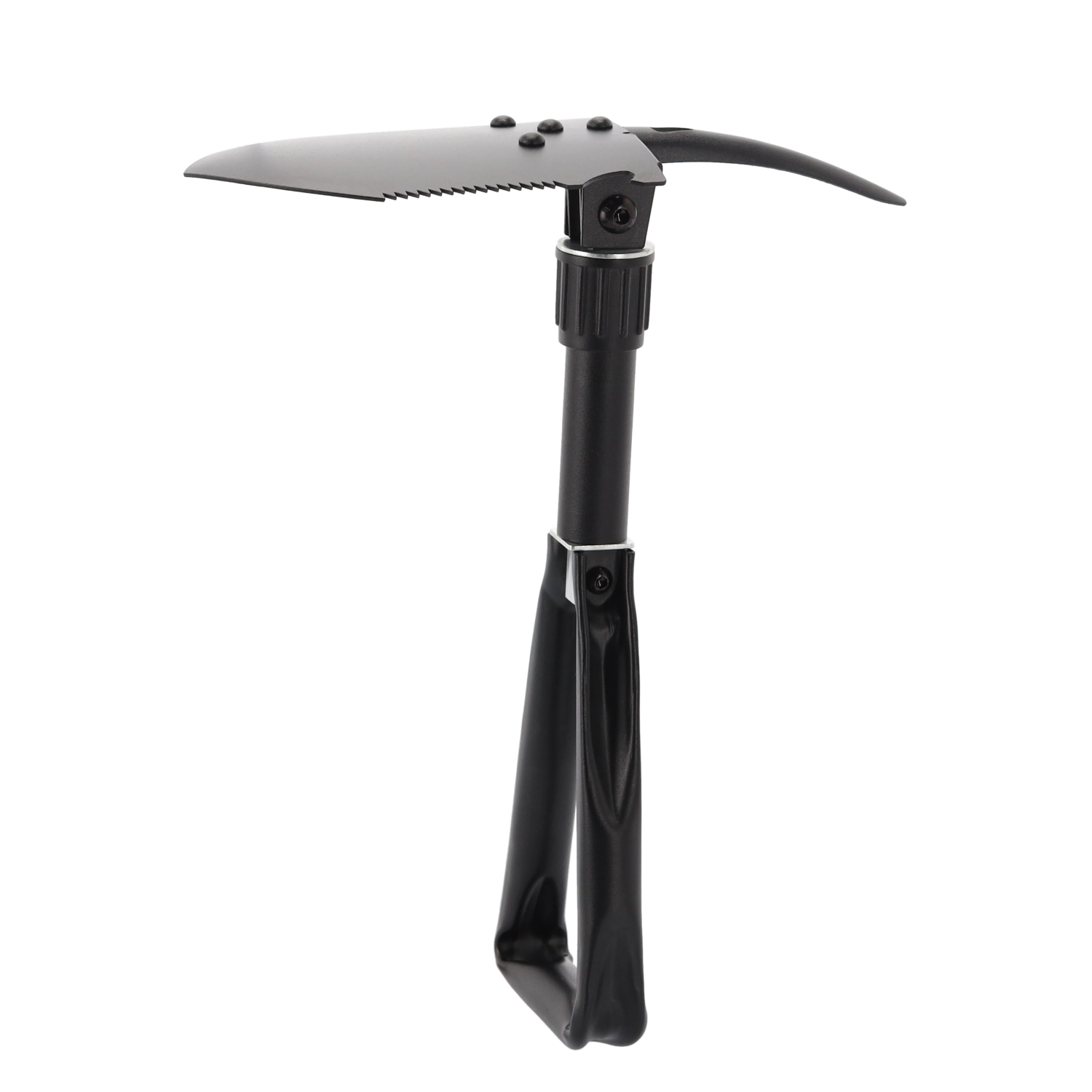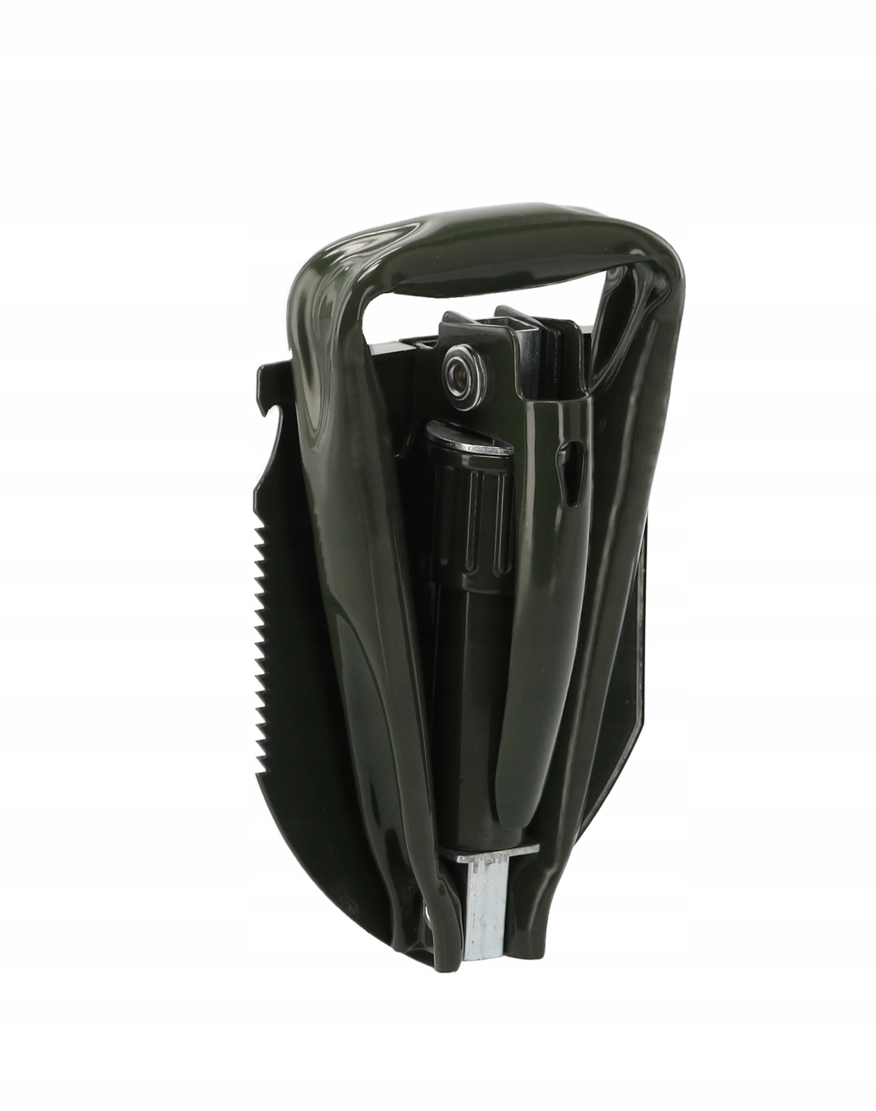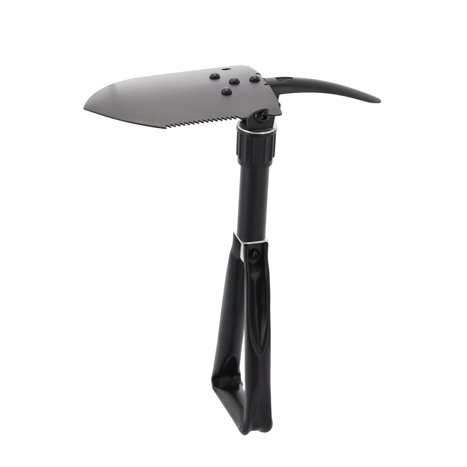 Ta vzdržljiva zložljiva lopata združuje lopato, motiko, žago, kramp, imbus ključ in odpirač za steklenice v enem orodju. Obvlada kopanje, razbijanje tal, rezanje korenin in vej ter drobna opravila na prostem. Rezilo iz manganovega jekla z žagastim robom in zaklepnimi tečaji zagotovi stabilnost pri obremenitvi.
