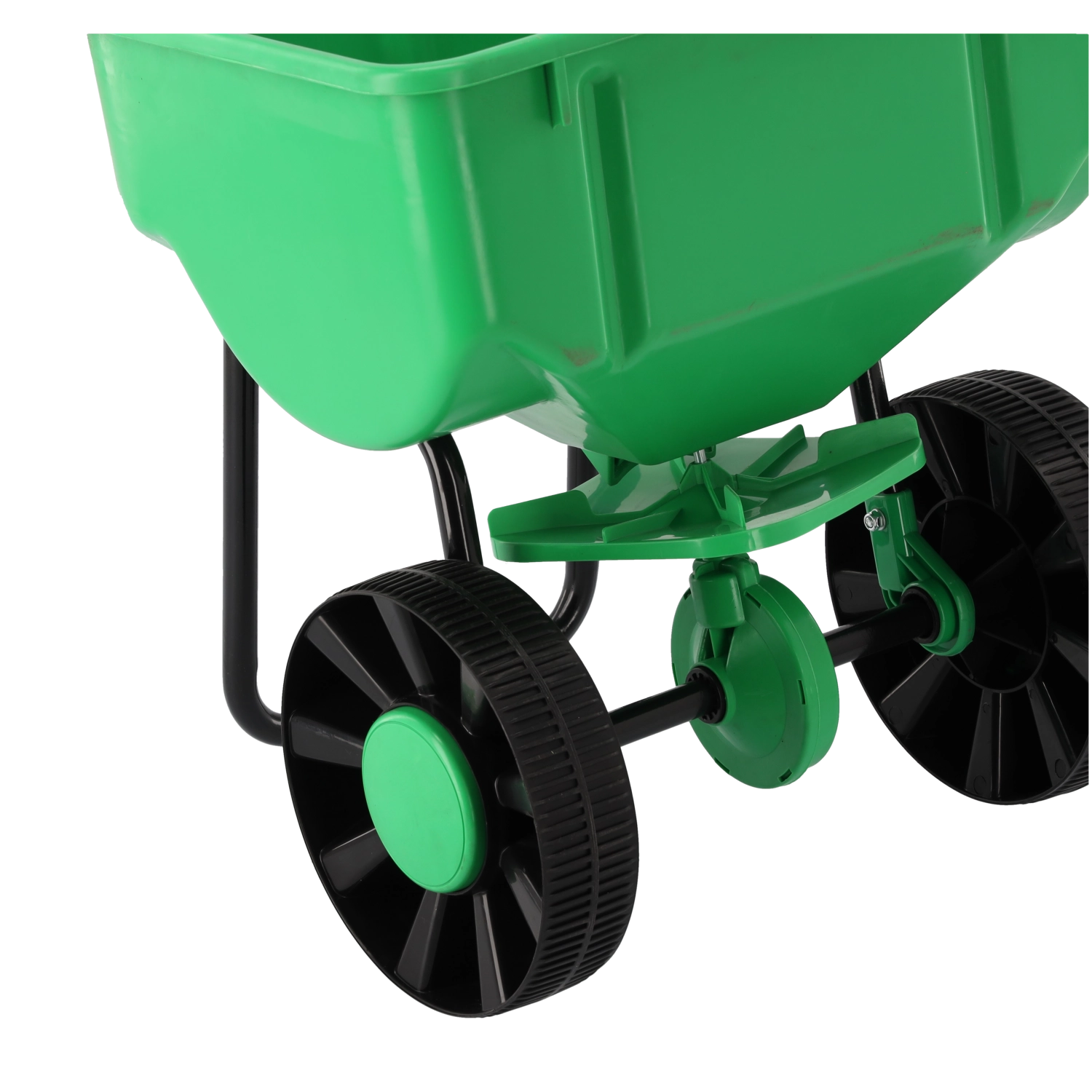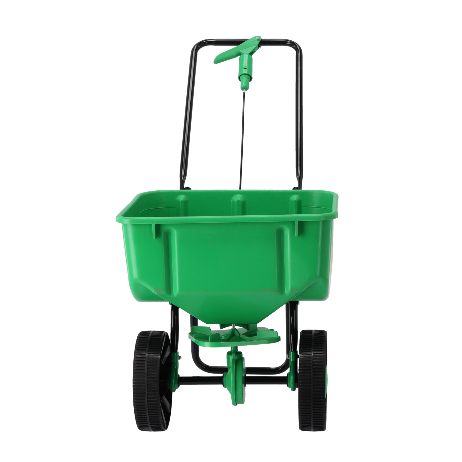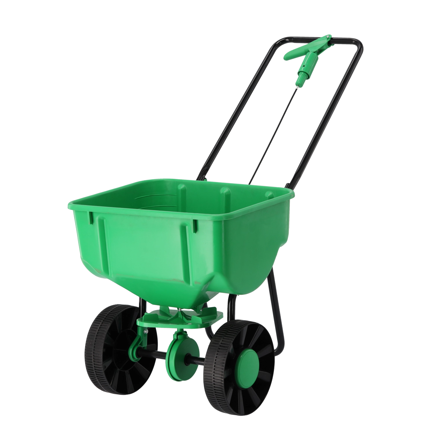 Velika kolesa zagotavljajo gladko premikanje in stabilnost, upravljalna ročica pri ročaju omogoča natančno nastavitev pretoka za enakomeren raztros.