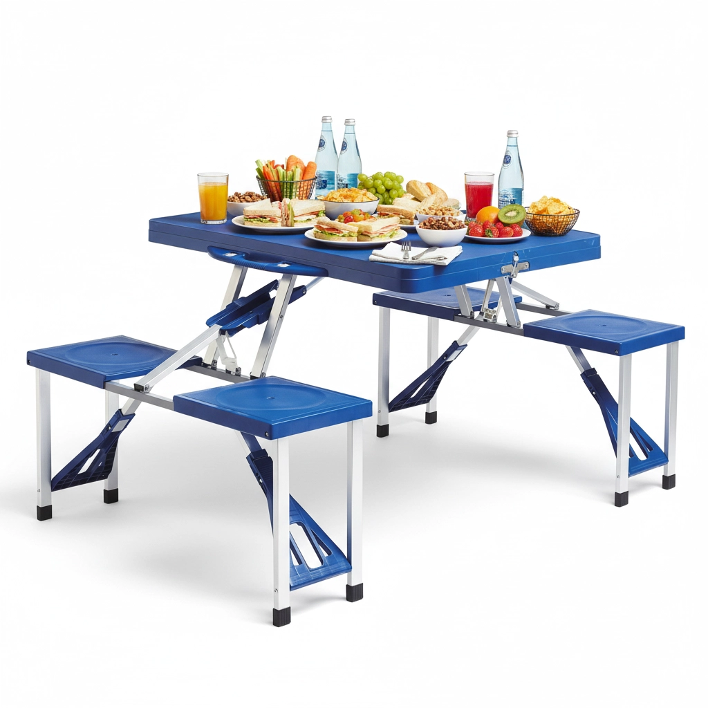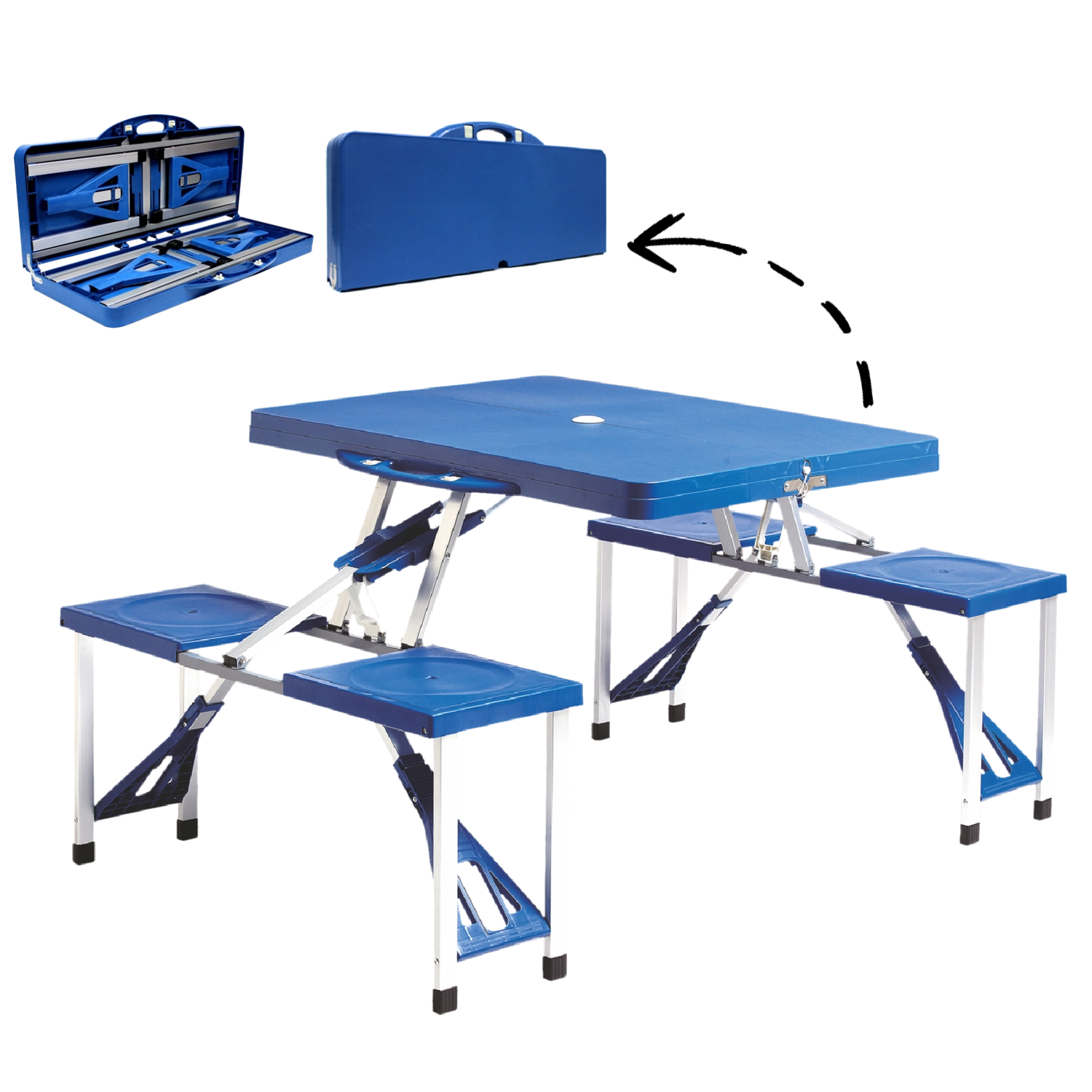 Praktična in lahka zložljiva piknik miza s štirimi vgrajenimi sedeži v modri barvi je idealna za piknik, kampiranje, vrt in ob jezeru. Razprete jo v nekaj sekundah, nosi do 150 kg in zahvaljujoč odprtini za senčnik uživate v prijetni senci tudi v vročih dneh.