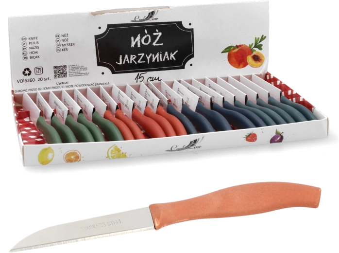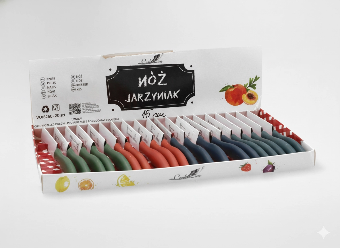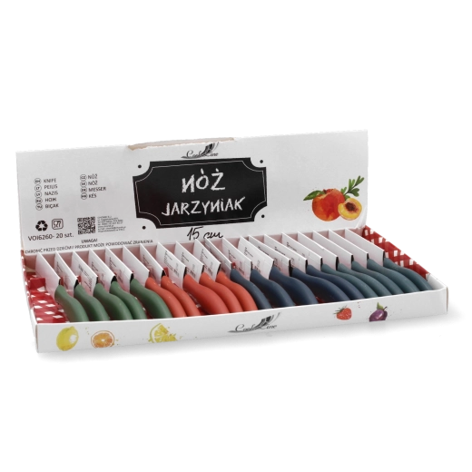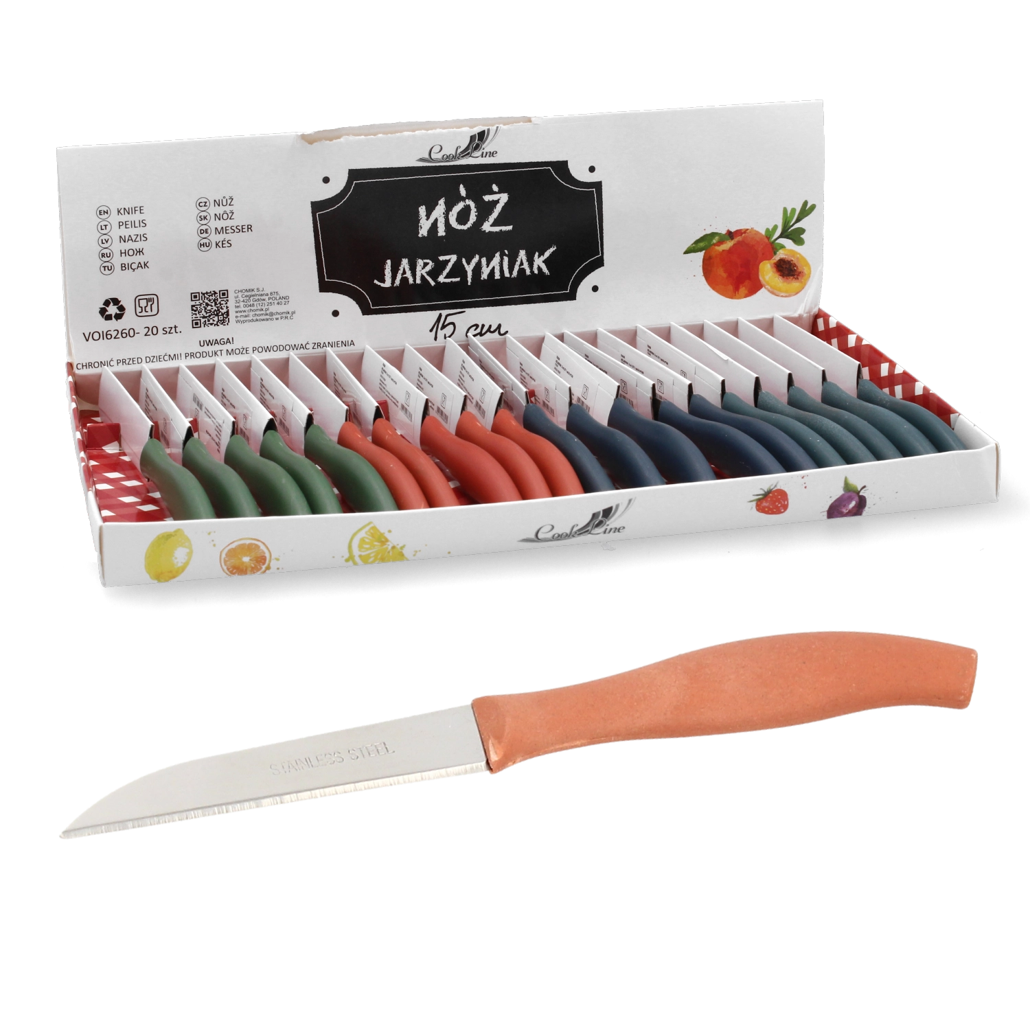 Praktičen nož za zelenjavo z dolžino rezila 15 cm za natančno rezanje sadja in zelenjave. Ergonomski ročaj zagotavlja udobno uporabo, v pakiranju pa je kar 20 kosov – idealno za restavracije, catering in gospodinjstva. Univerzalna dolžina rezila, zanesljiva zmogljivost in ugodno pakiranje za vsakodnevno delo v kuhinji.