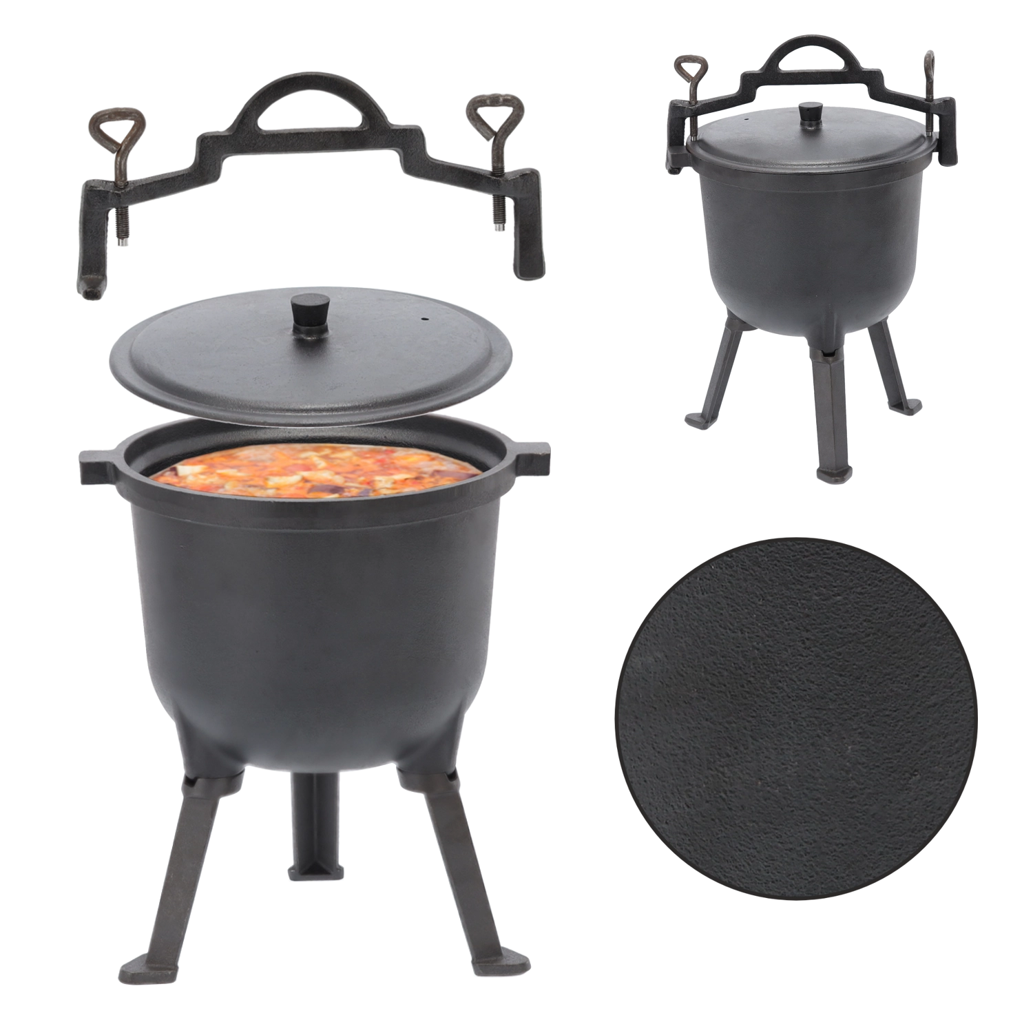 Tri čvrste noge in pokrov zagotavljajo varno in udobno kuhanje nad plamenom. Ročaj omogoča enostavno prenašanje ali obešanje na trinožnik.