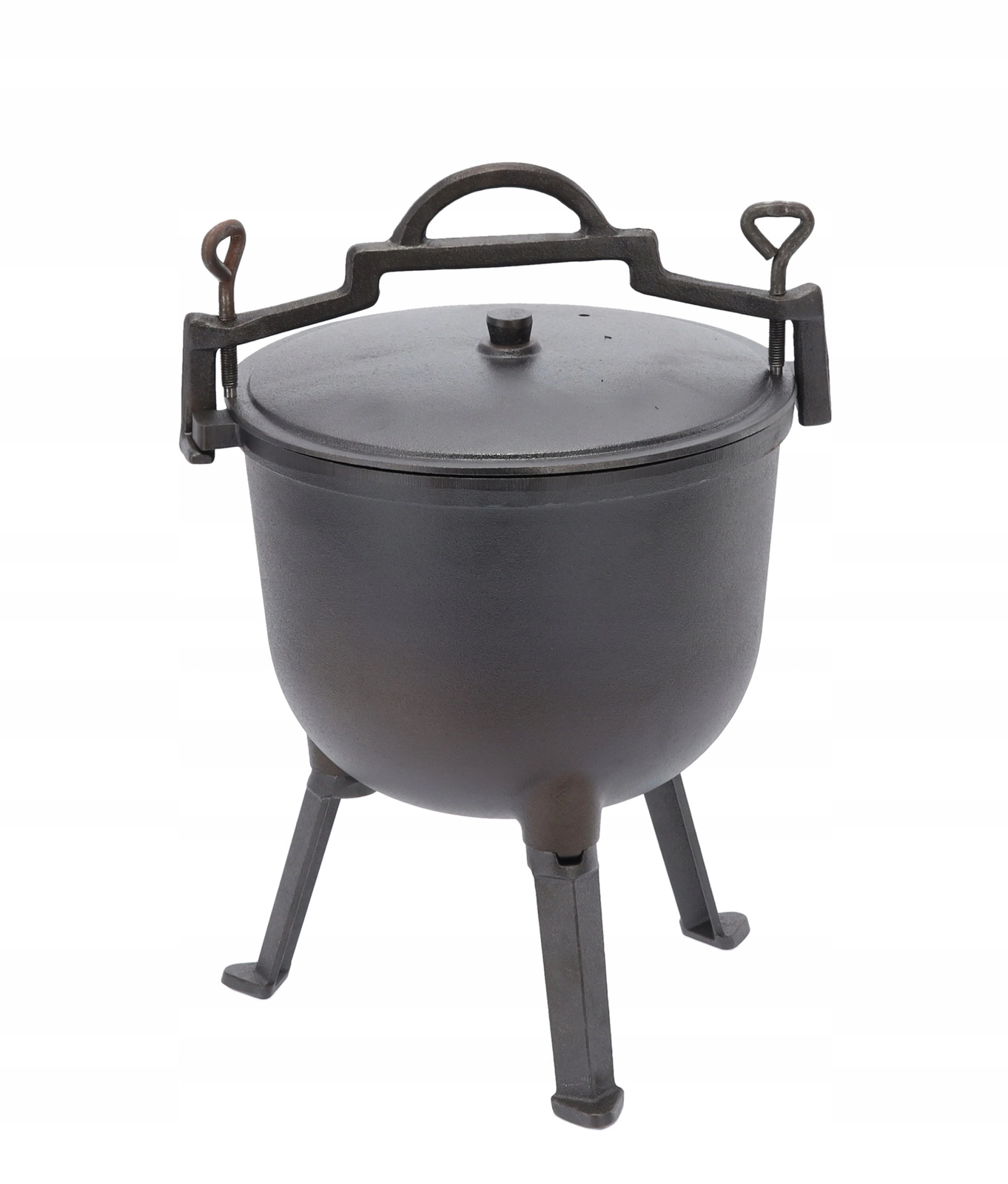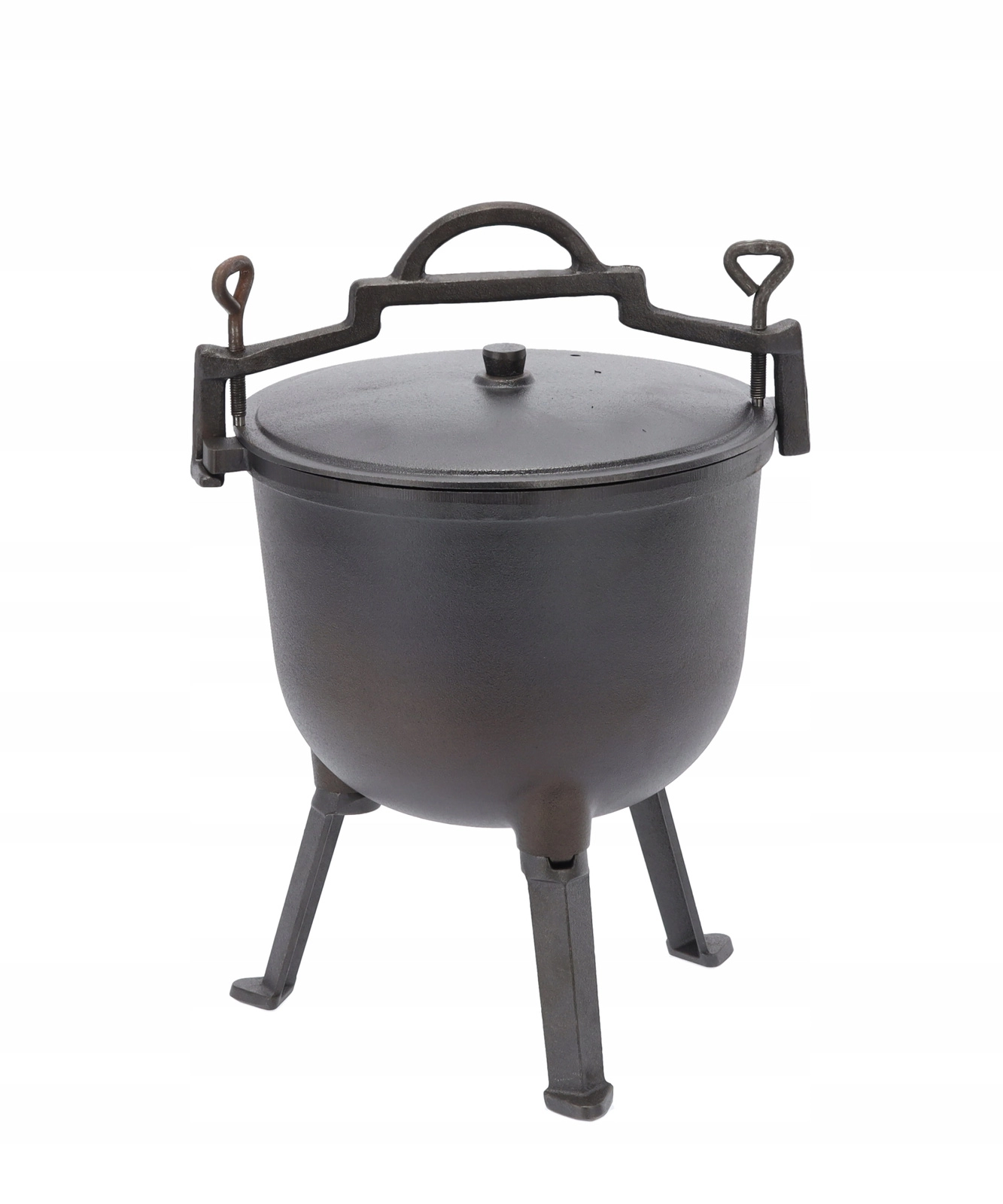 Ta veliko-prostorninski litoželezni kotel je ustvarjen za golaž, juhe in počasno dušenje nad ognjem. Trdna konstrukcija prenese visoke temperature in spremenljive zunanje razmere, pokrov pa ohranja vlago in okus v notranjosti. Zahvaljujoč ročaju se kotel zlahka prenaša in obeša nad ogenj.