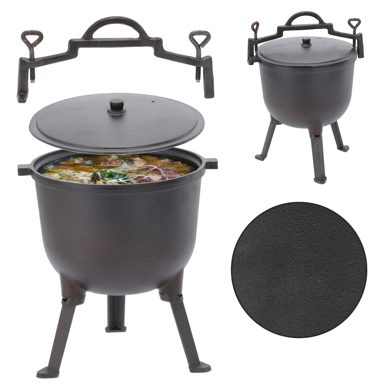 Težak pokrov pomaga zadržati vlago in aromo v notranjosti, medtem ko trden ročaj omogoča varno prenašanje ali obešanje kotla nad ognjem.