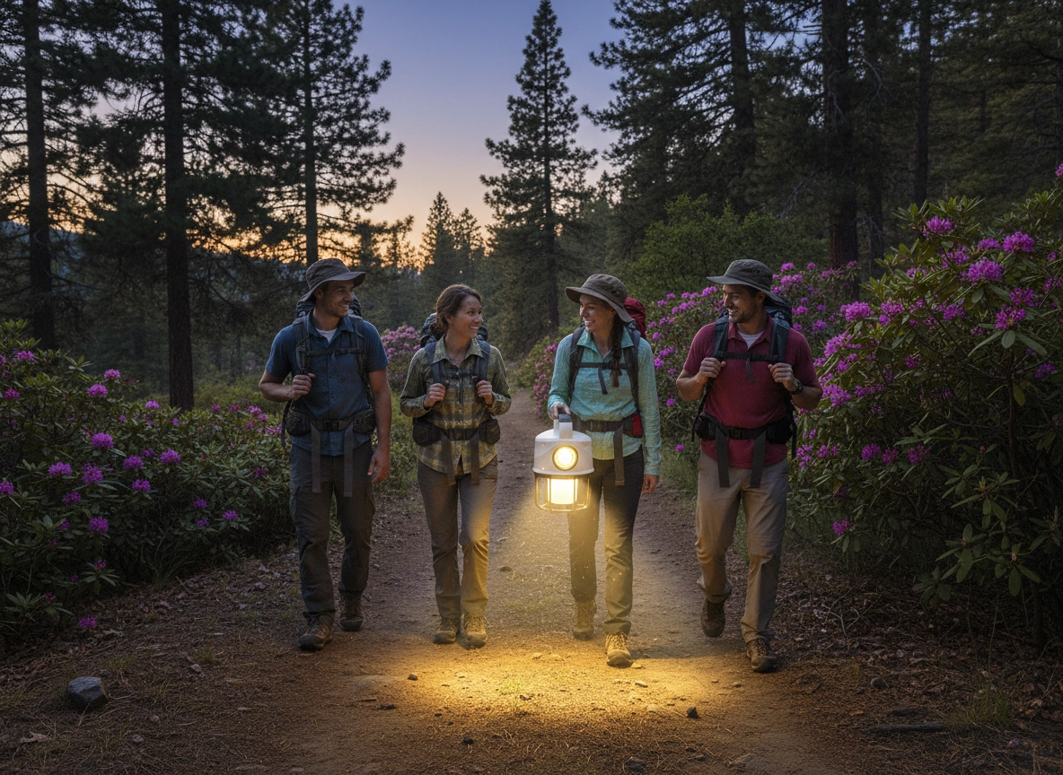 Osvetlite kamp, pot in delavnico. Difuzna spodnja luč zagotovi prijetno površinsko osvetlitev, medtem ko stranski reflektor ponudi oster, usmerjen snop za delo in orientacijo.
