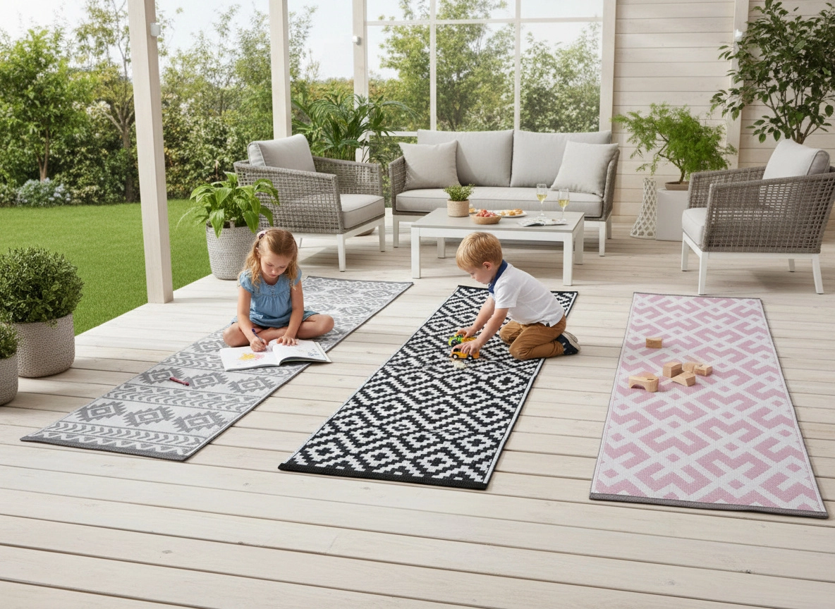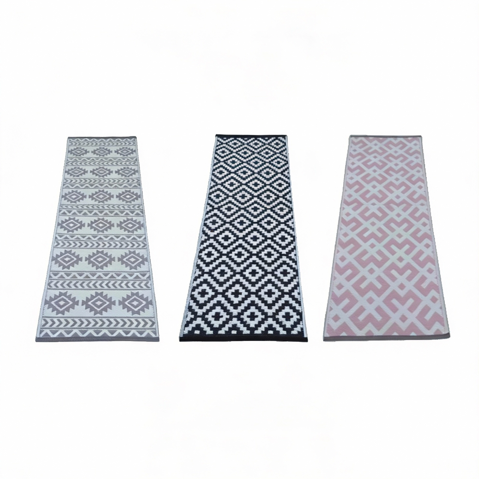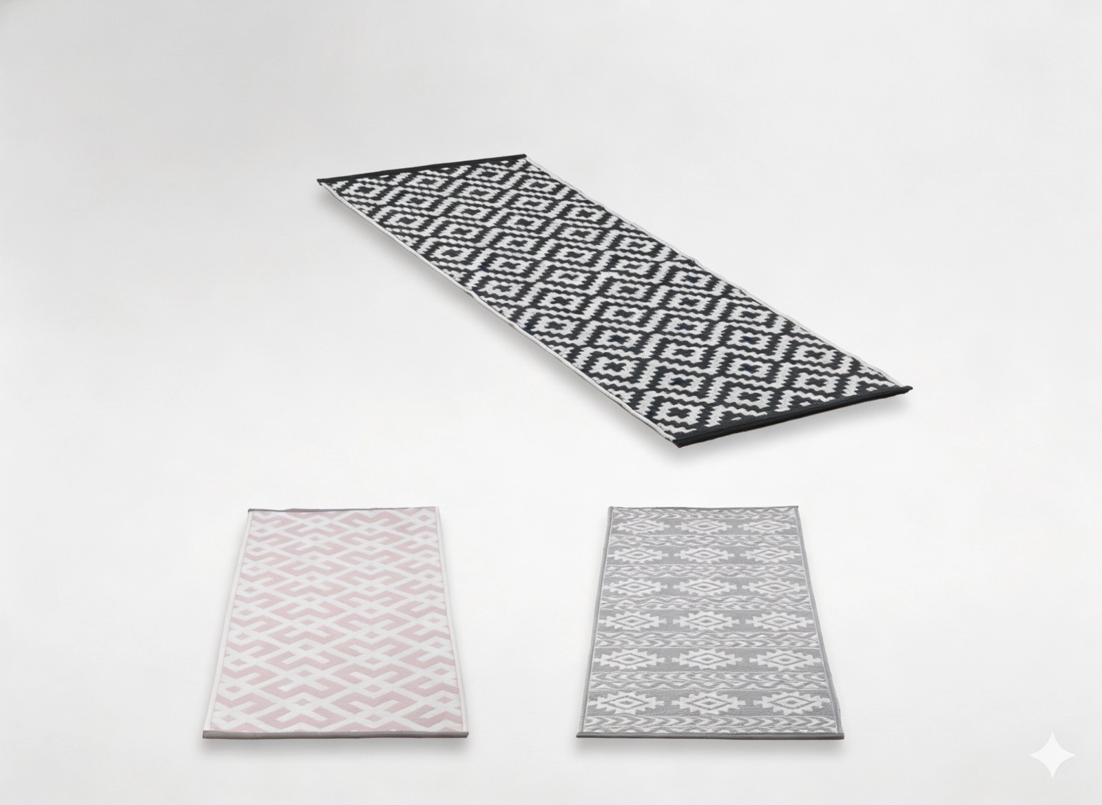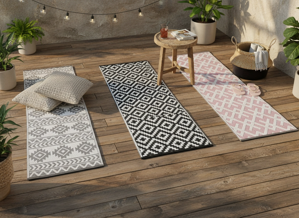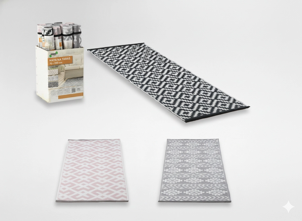 Praktična in dekorativna podloga/tekač za teraso ustvari prijetno cono za sprostitev in druženje. Preprosto vzdrževanje ter odpornost na vlago in UV jo naredita idealno izbiro za zunanje prostore in obremenjene vhodne hodnike. Univerzalna velikost 70 × 180 cm je odlična pred vrati, ob vrtnem sedišču in v ozkih prehodih.