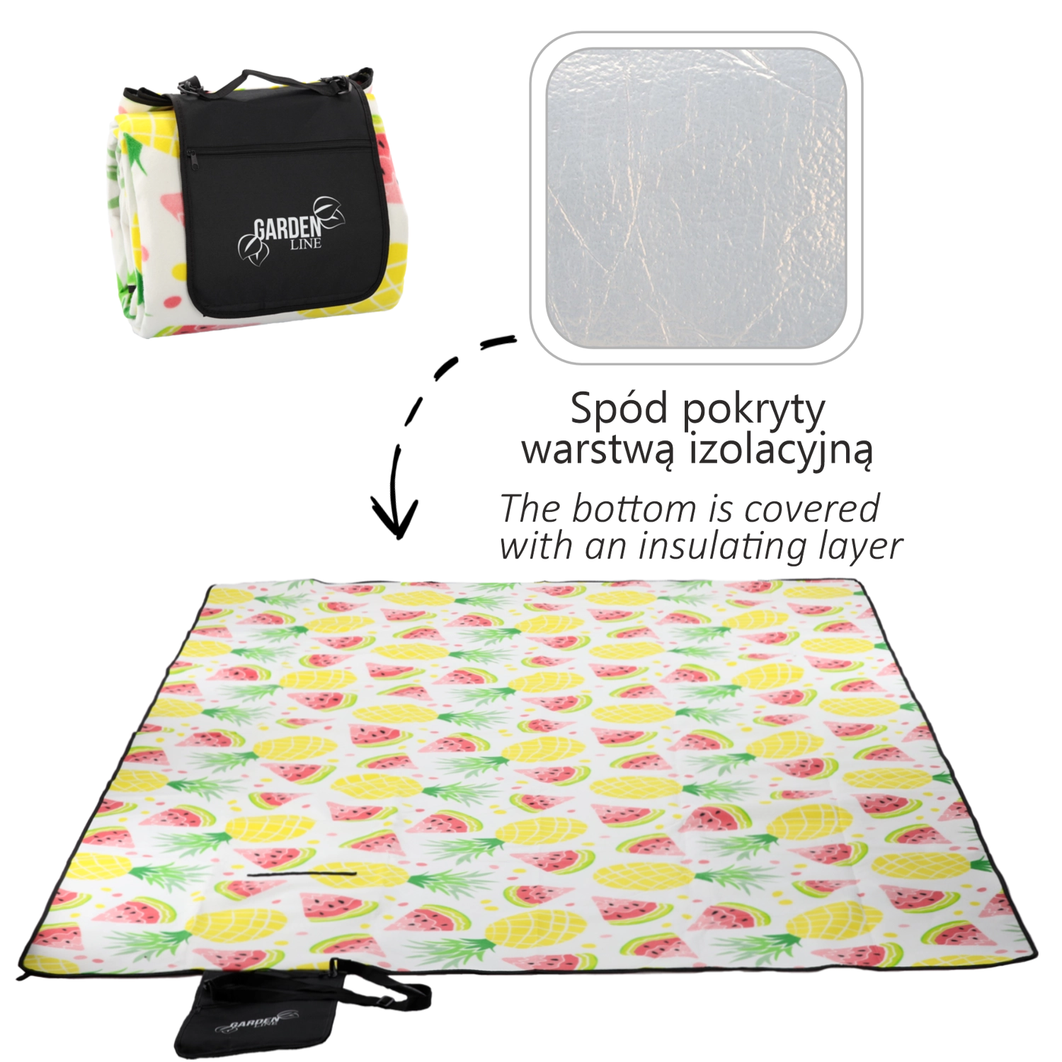 Ta stilska piknik odeja z motivom sadja je idealna za parke, vrtove in plažo. Spodnja aluminijasta/izolativna plast zanesljivo preprečuje prodiranje vlage in mraza, medtem ko mehko penasto polnilo povečuje udobje pri sedenju ali ležanju. Zgornja tekstilna stran je prijetna na dotik in hkrati trpežna za vsakodnevno uporabo.