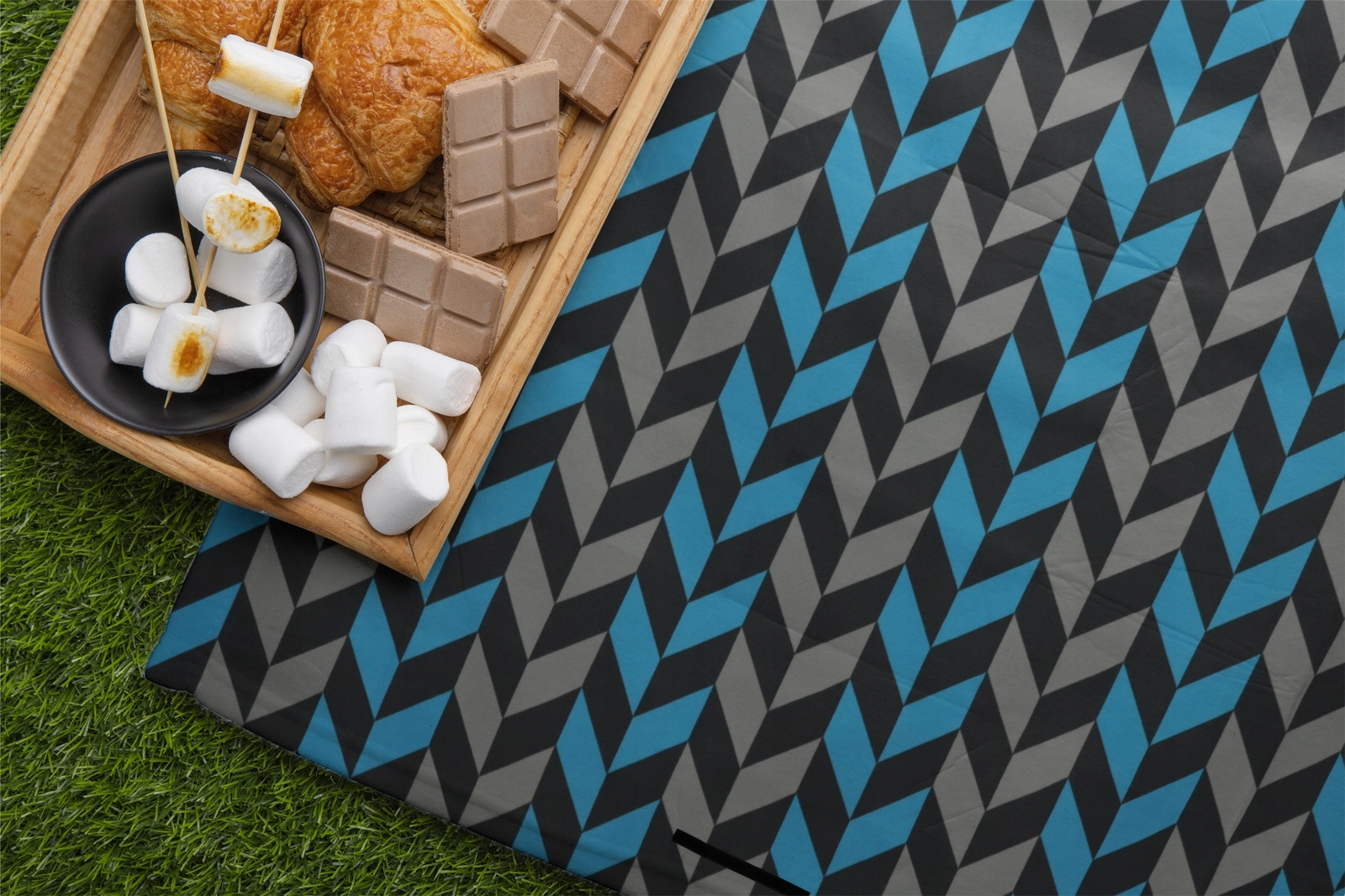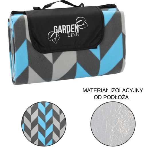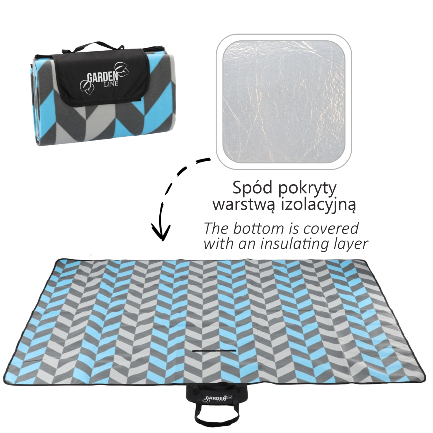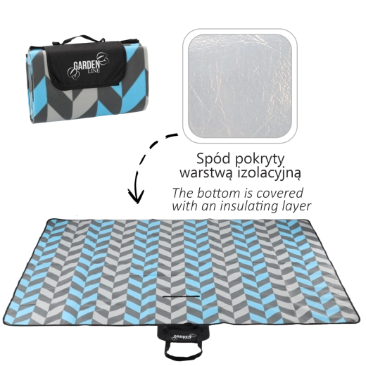 Odejo zlahka zložite v kompakten paket z zapiralno preklopko, ročajem in trakom za prenašanje. Moder in siv odtenek modernega vzorca jolka se prilega vsaki priložnosti in vašemu pikniku doda stil.