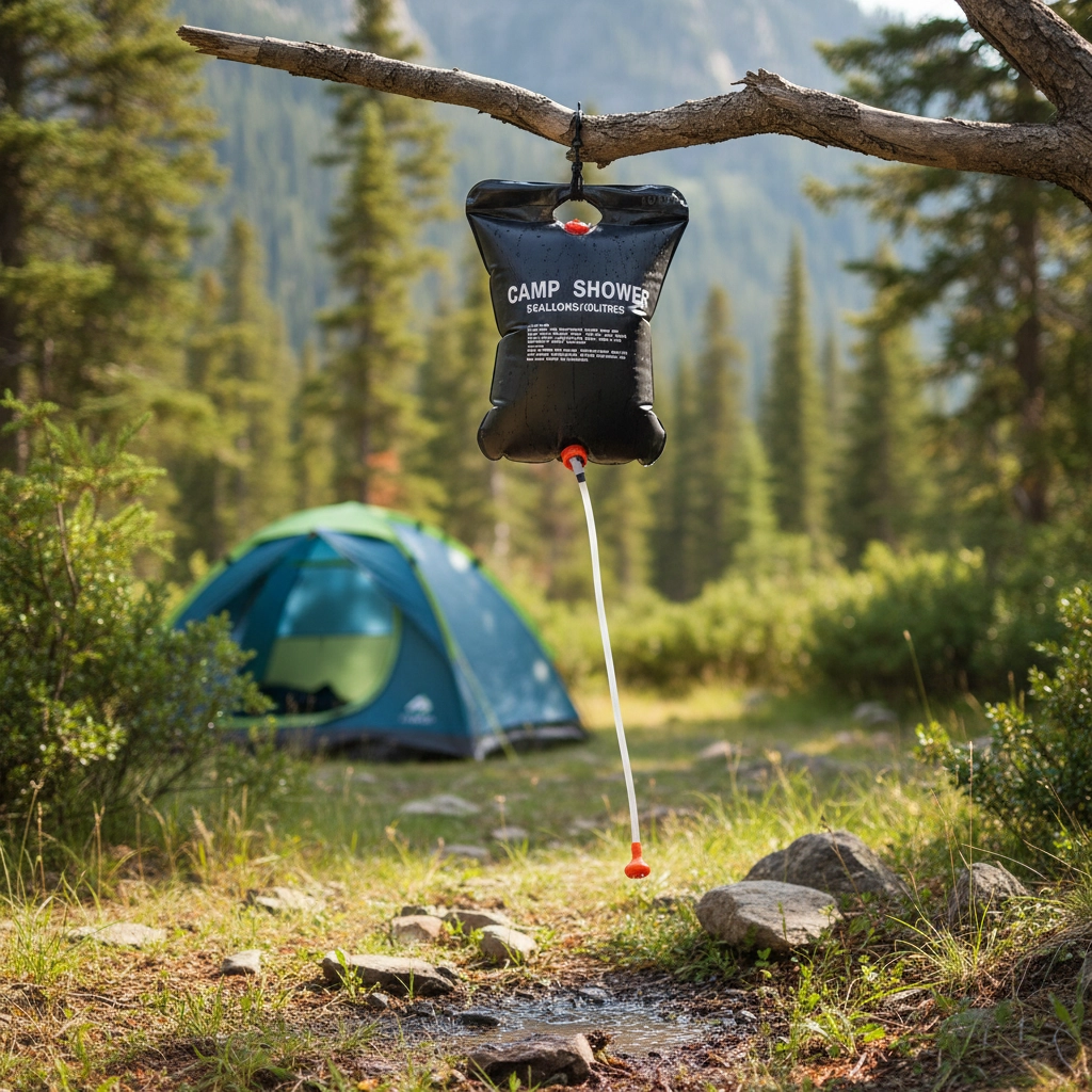 Črna vreča učinkovito absorbira sončno sevanje in segreva vodo čez dan – idealno za udobno prhanje v kampu ali na izletu.