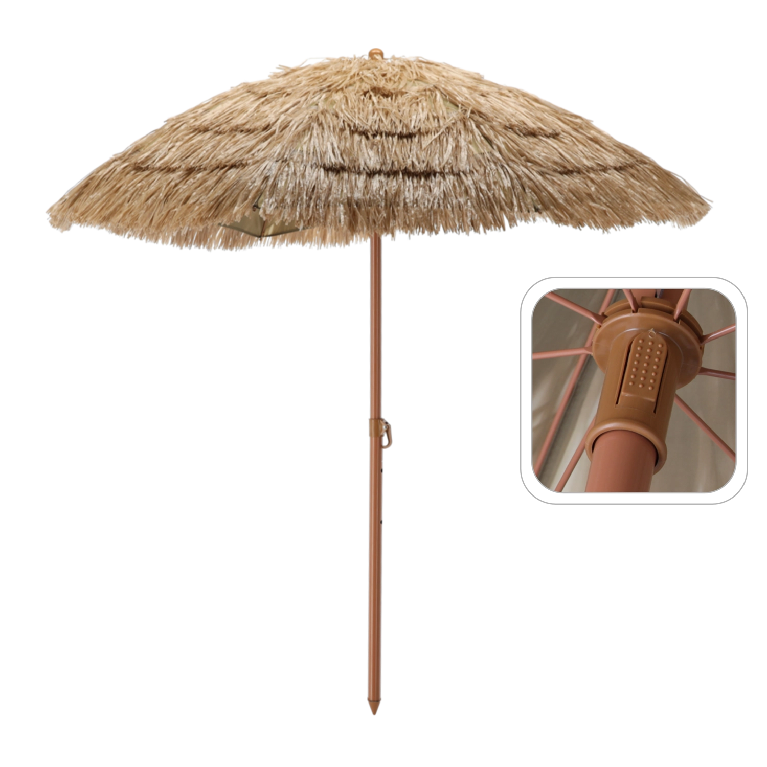 V svoj dom vnesite pridih tropov s havajskim plažnim senčnikom, ki združuje stilski eksotični videz z učinkovito zaščito pred soncem. Robustna jeklena konstrukcija z 8 rebrami in slamnat videz iz PP vlaken zagotavljata senco in udobje na plaži, ob bazenu ali na vrtu.